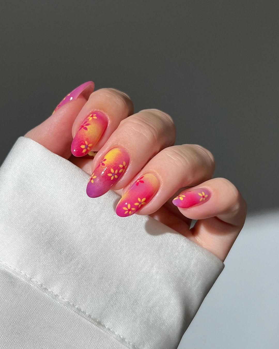 @heygreatnails serves color therapy in the prettiest way possible. This gradient blends sunset pinks and winter golds into a manicure that feels like golden hour meeting snow day. Tiny daisy accents add a playful, unexpected twist.