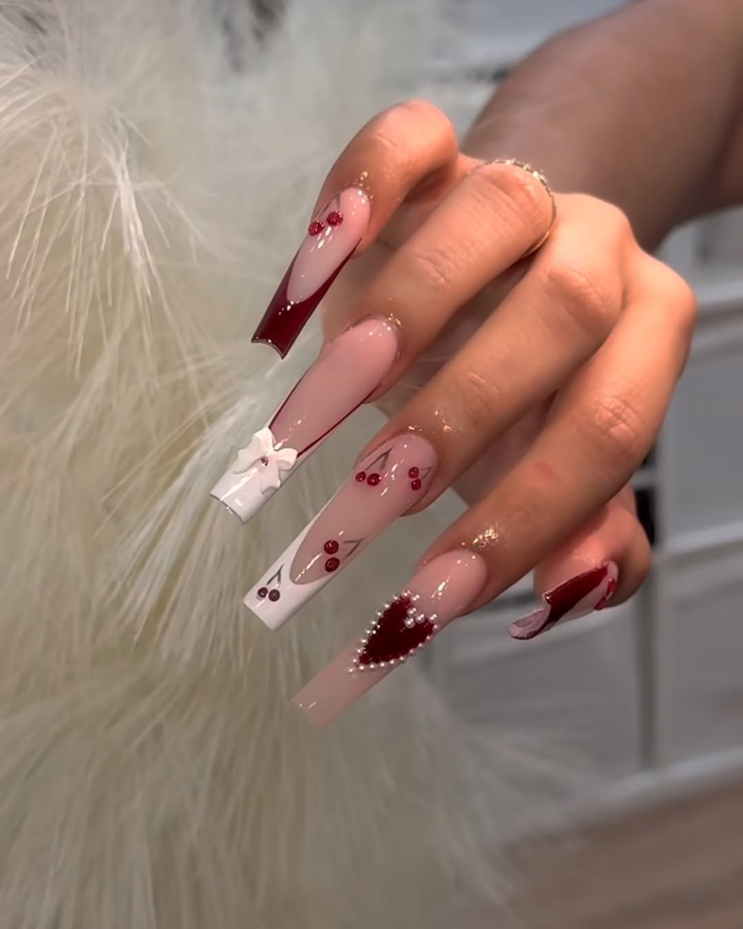 These nails by @ardentnailslashes_ are like a love letter to winter — delicate, glamorous, and just the right amount of extra. The blush pink base creates that soft, romantic canvas, while deep ruby accents and tiny pearl outlines bring a couture-level drama. The white bow and gem details tie everything together — literally.