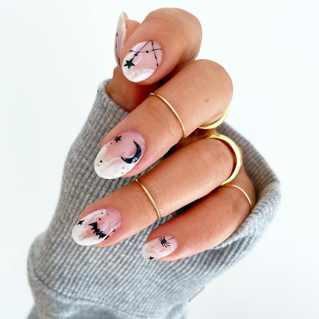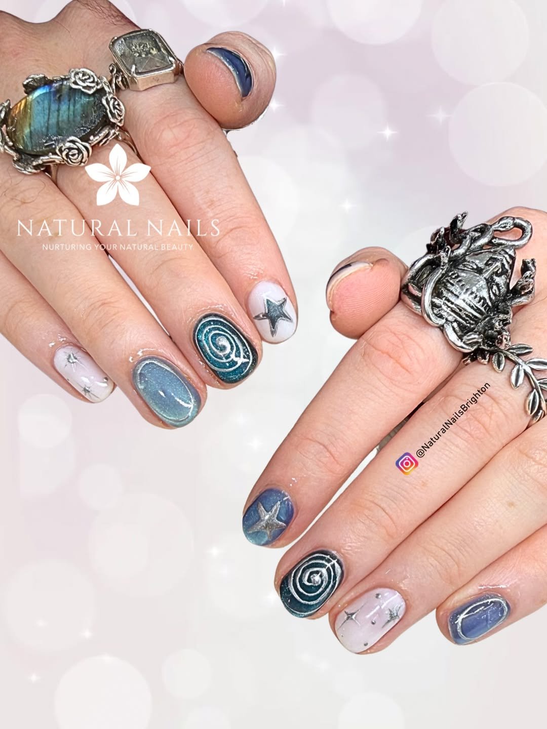 This set feels like a night sky translated into nail art. Deep blues, soft shimmer, and tiny celestial details give it a slightly mystical edge.