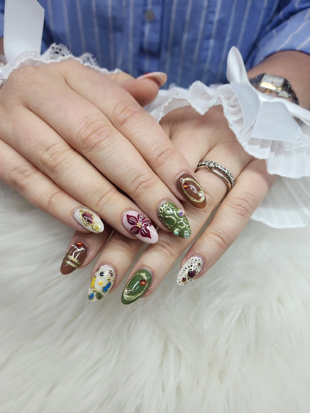 Every nail tells a different story here, like a curated collection of little treasures. Deep greens, warm browns, and glints of gold create a rich, grounded palette.