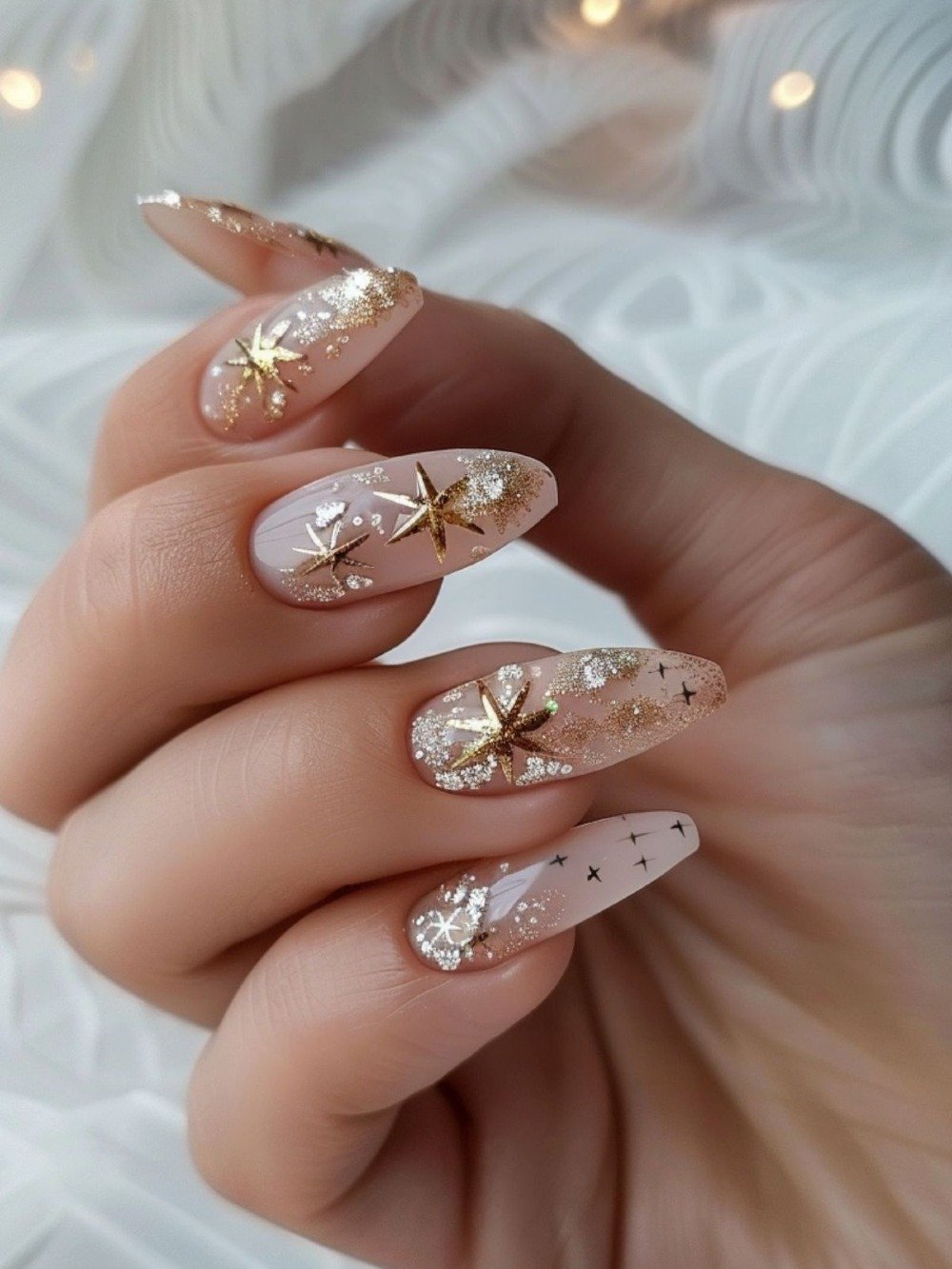 These nails feel like sunlight catching on tiny details. The soft blush base with scattered gold stars creates a dreamy, almost celestial finish.