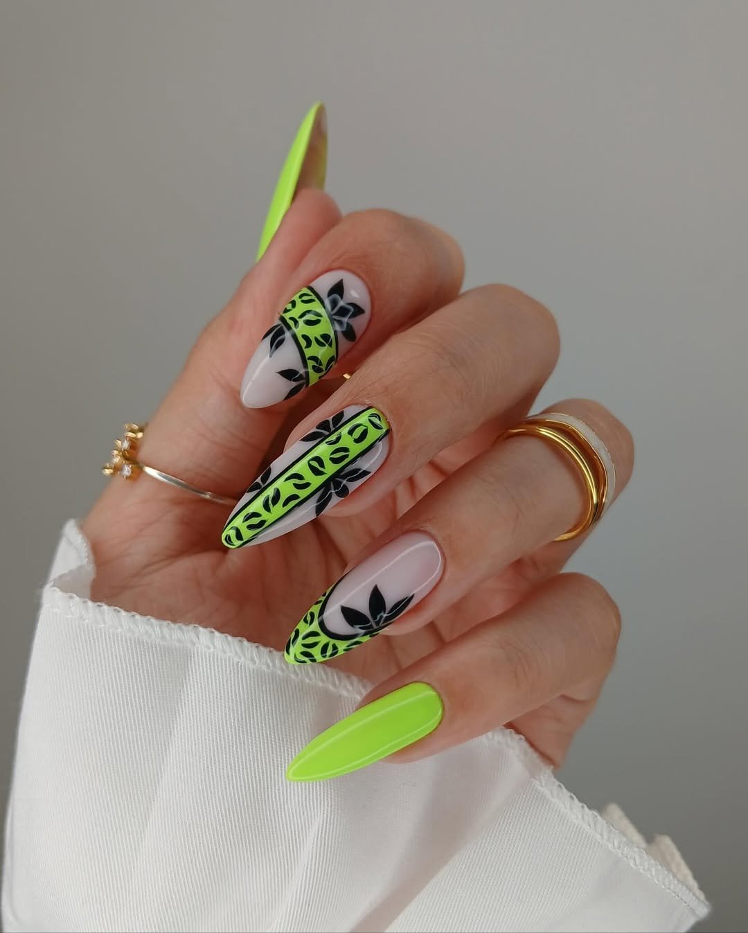 This one leans bold, but still grounded in nature. The electric green paired with leafy motifs brings a fresh, almost tropical energy that feels alive.