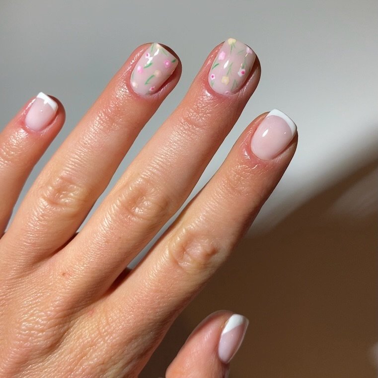 Tiny florals scattered over a soft base with classic French tips create something that feels fresh and easy.
