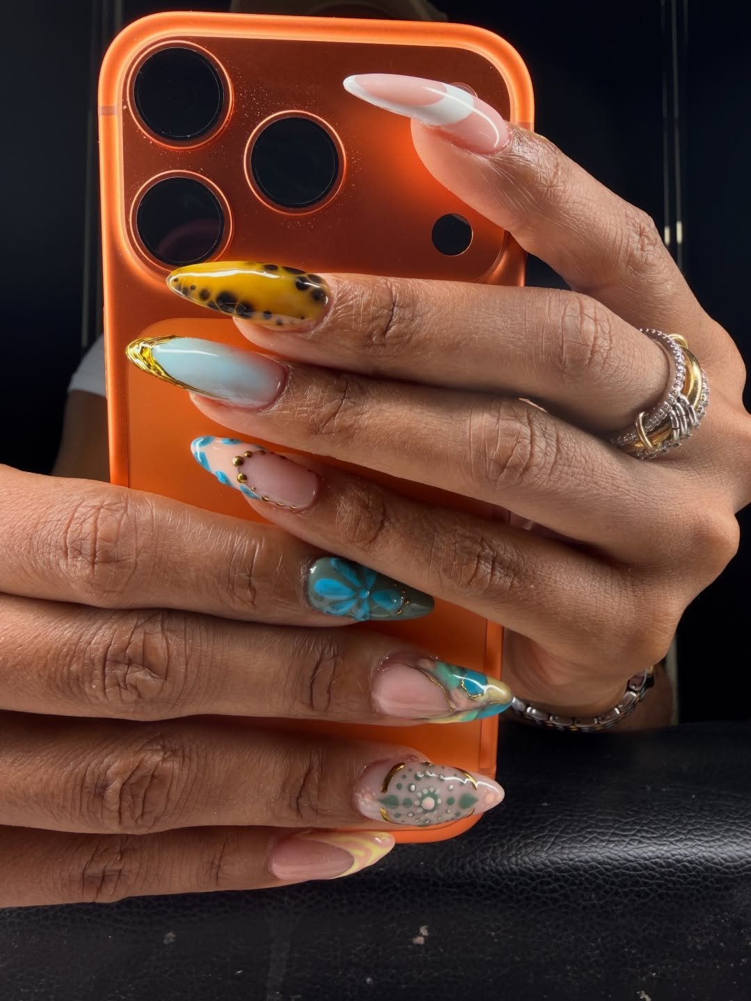 Every nail here feels like its own tiny canvas. Turquoise, amber, soft neutrals, and gold accents all come together in a way that somehow just works.