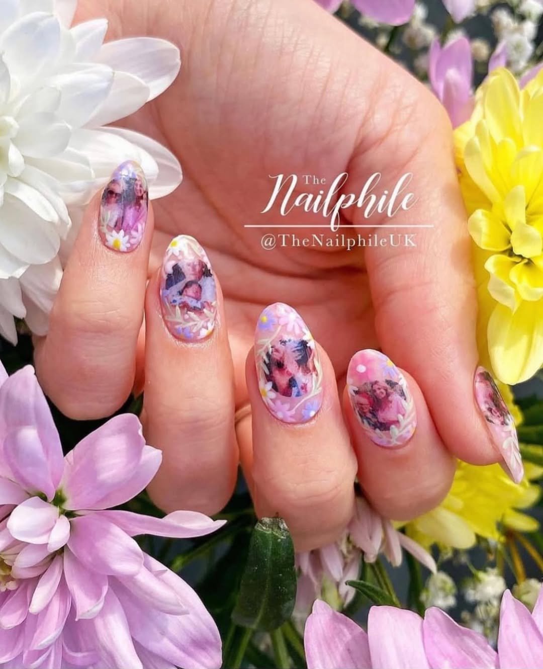 These nails feel like miniature paintings. Soft floral overlays, blended colors, and delicate details create a dreamy, almost watercolor effect.