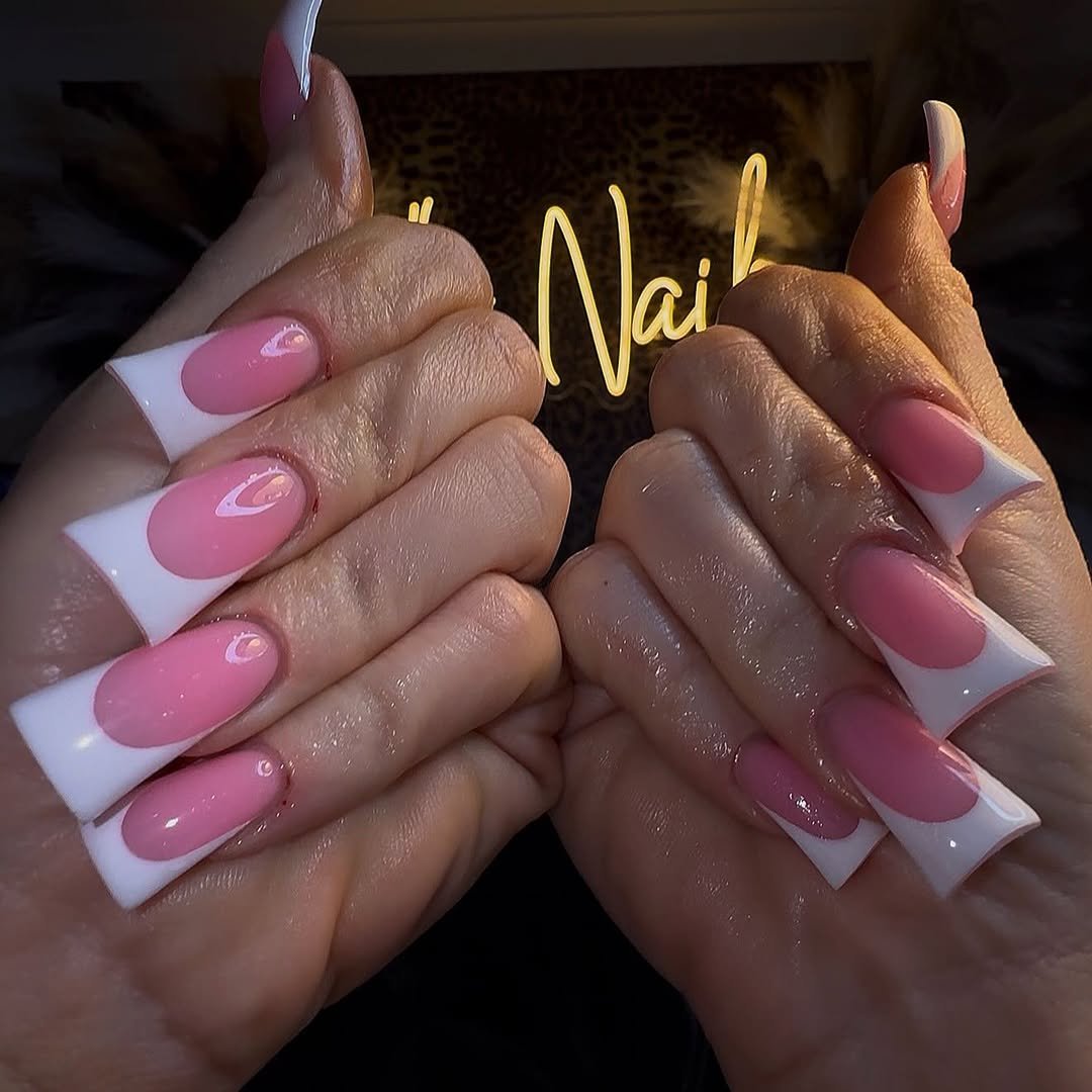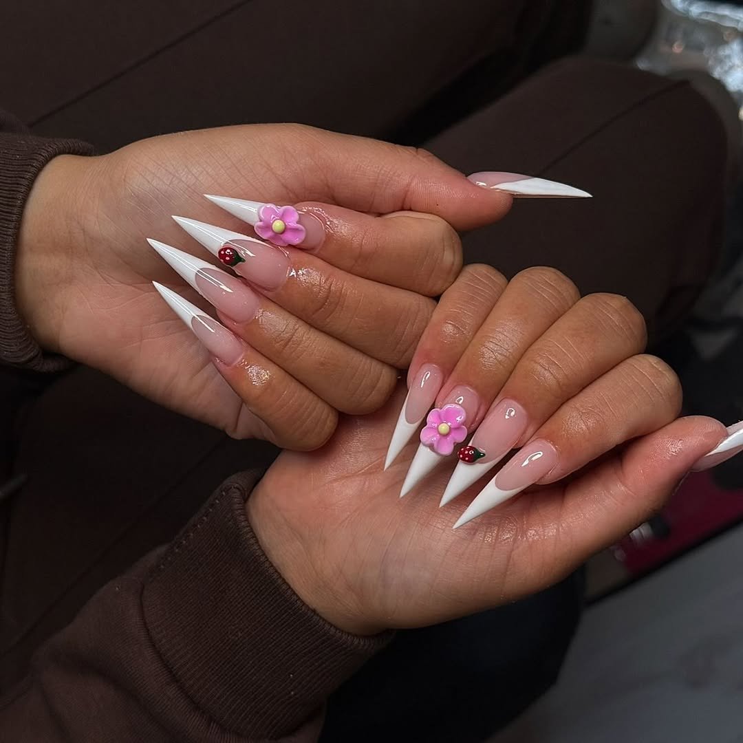 Soft pink bases with crisp white tips and tiny floral accents feel like the prettiest finishing touch.