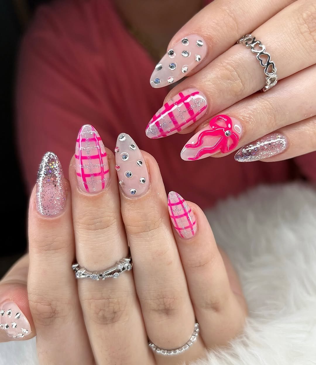 This set feels like a little celebration on your fingertips. The mix of hot pink plaid, crystal accents, and soft glitter brings a playful, almost nostalgic charm that still feels polished.