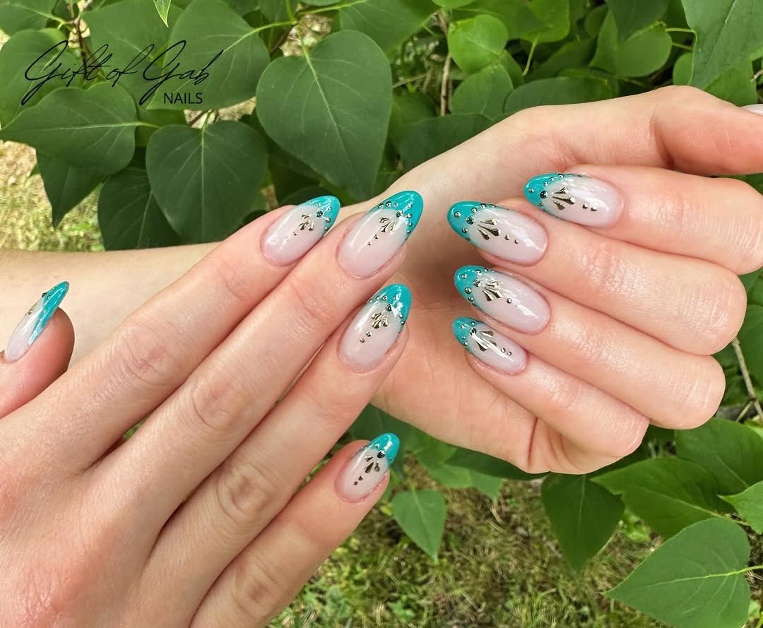 A soft base with turquoise tips feels like a breath of fresh air. The tiny floral accents add just enough detail without taking over.