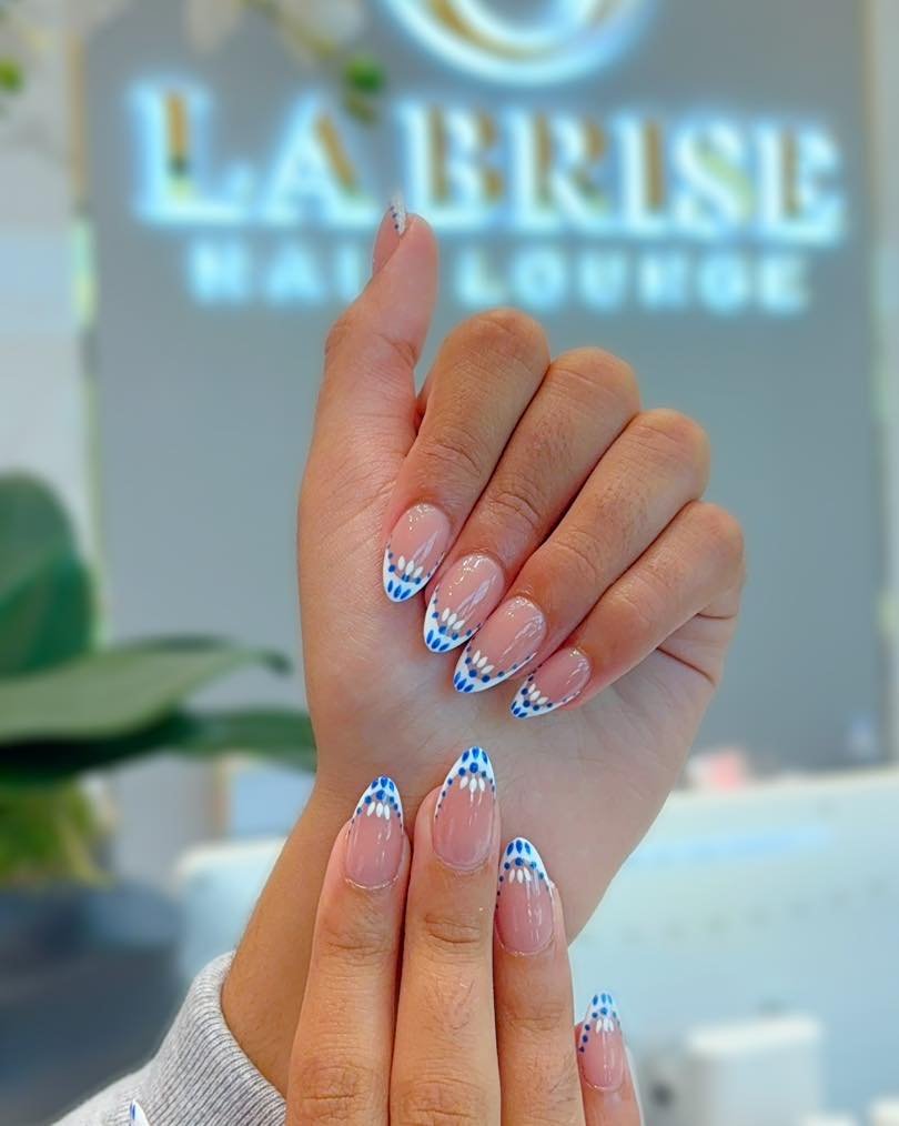 A soft nude base meets tiny cobalt dots that dance along the tips like confetti caught mid-air. It’s delicate at first glance, but there’s a playful rhythm to the pattern that keeps your eyes lingering.