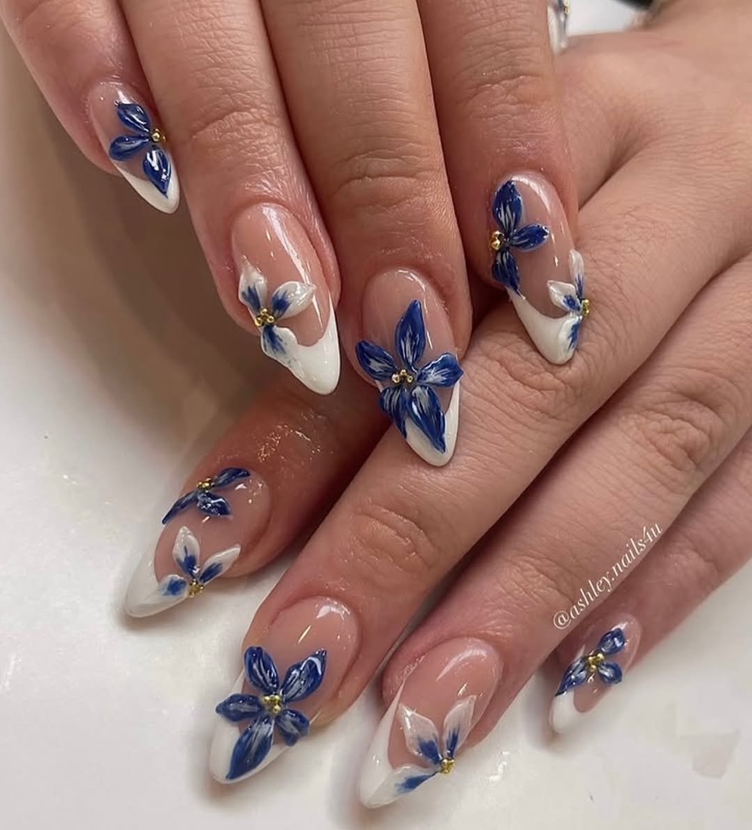 Crisp white tips meet hand-painted cobalt florals, giving a subtle nod to vintage porcelain. The detailing feels delicate, but the color keeps it grounded in something more modern.