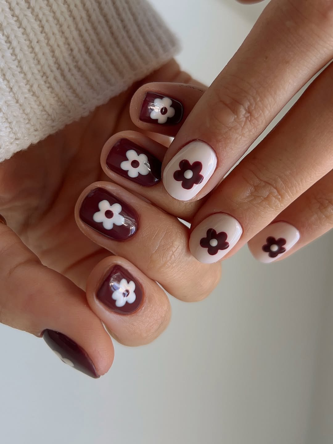 Deep cherry brown and soft cream play off each other in the sweetest way, dotted with tiny daisy blooms that feel both retro and fresh. The contrast is rich but still wearable, like your favorite iced coffee order turned into a manicure.