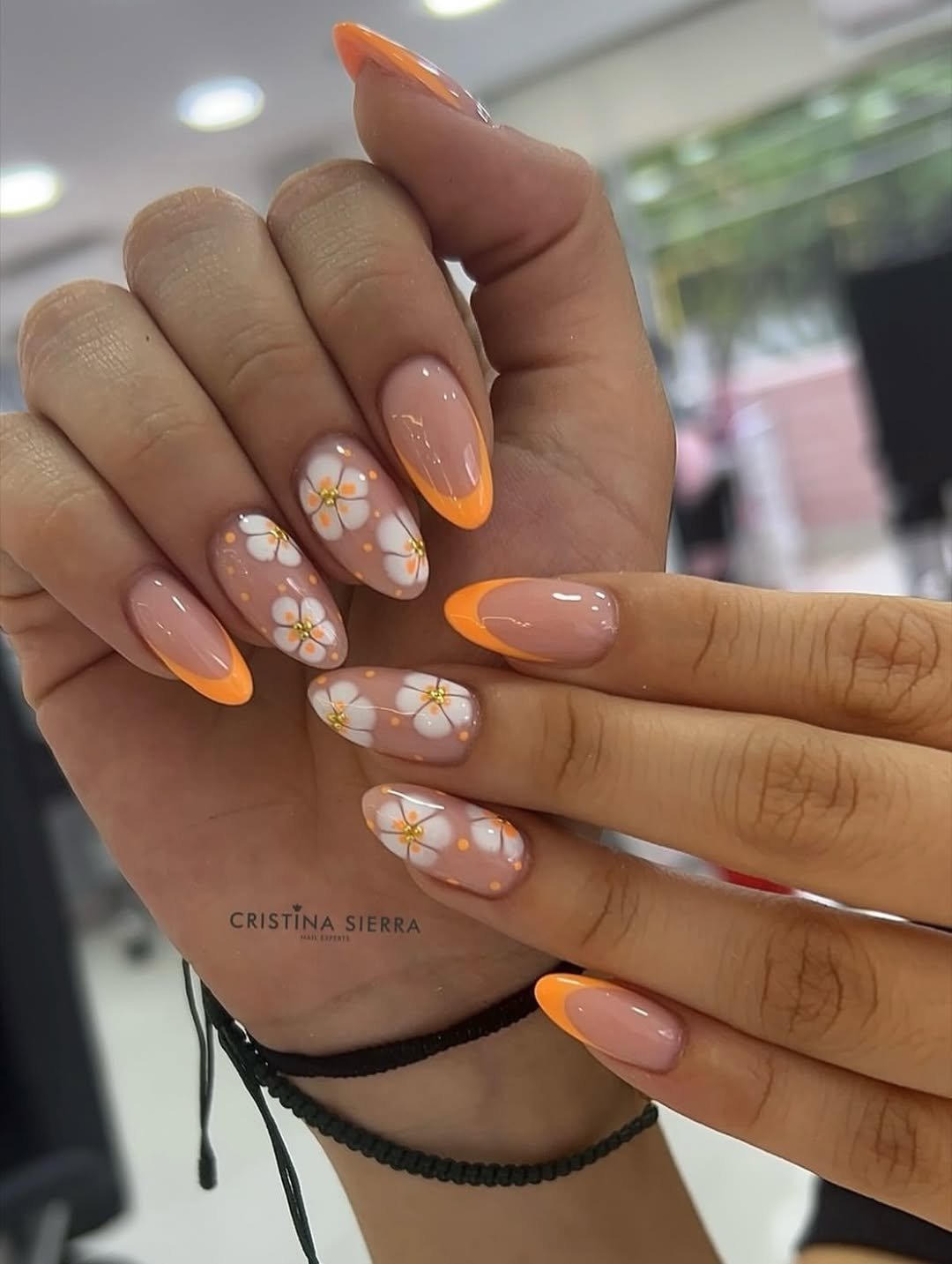 Peachy nude bases are finished with bright orange tips and scattered white florals, like little bursts of sunshine across each nail. The palette feels warm and glowing.