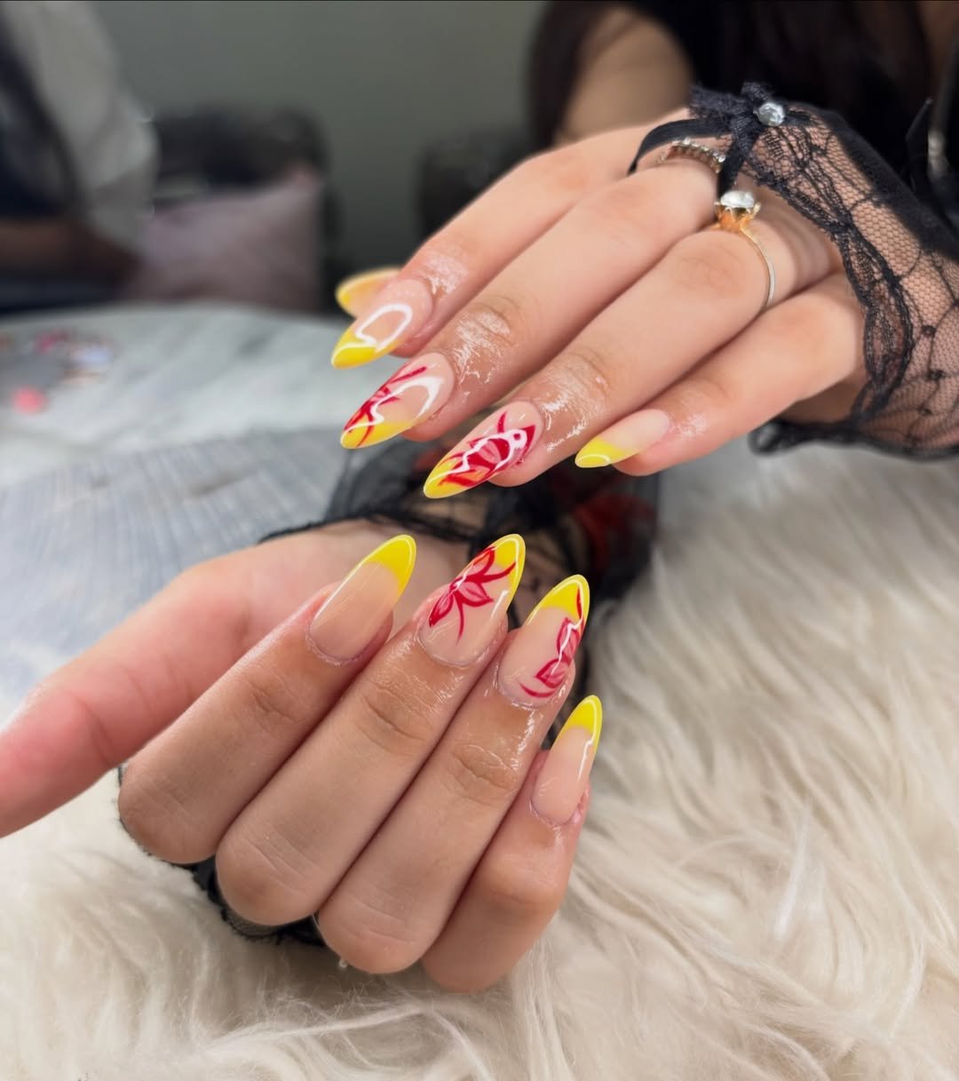 Soft nude bases are finished with lemon-yellow tips and delicate red floral strokes that curve like petals in motion. It’s bright, but there’s a softness to it that keeps things elegant.