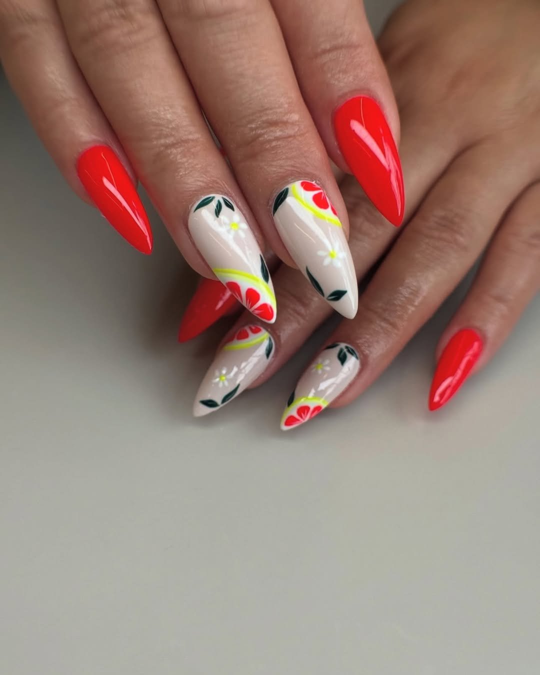 Sharp almond tips in a juicy red-orange meet creamy white bases dotted with tiny florals and citrus arcs. It feels fresh, like a chilled drink on a warm afternoon.