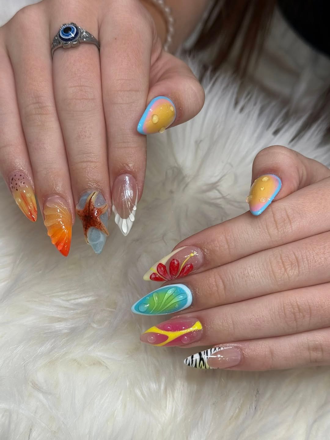 Every nail feels like a tiny postcard from a different destination. You’ve got citrus slices, ocean blues, zebra stripes, and sunset gradients all living side by side, yet somehow it works like a curated vacation mood board.