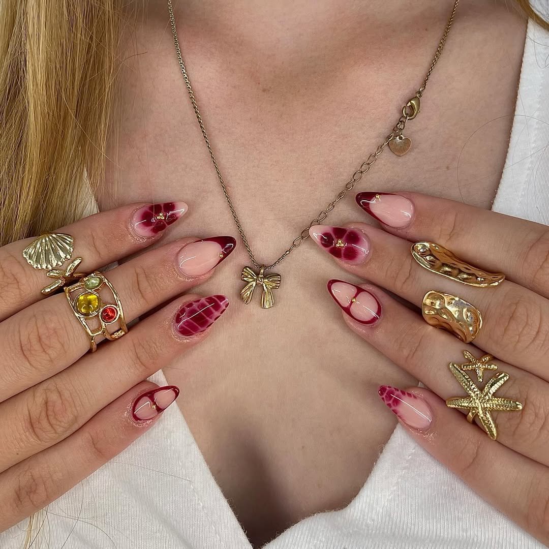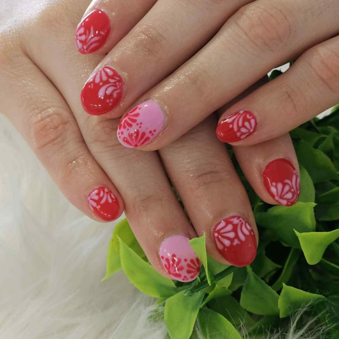 Glossy red and blush pink come together with soft floral overlays that almost melt into the base. The look feels juicy and light at the same time, like fruit in peak season.