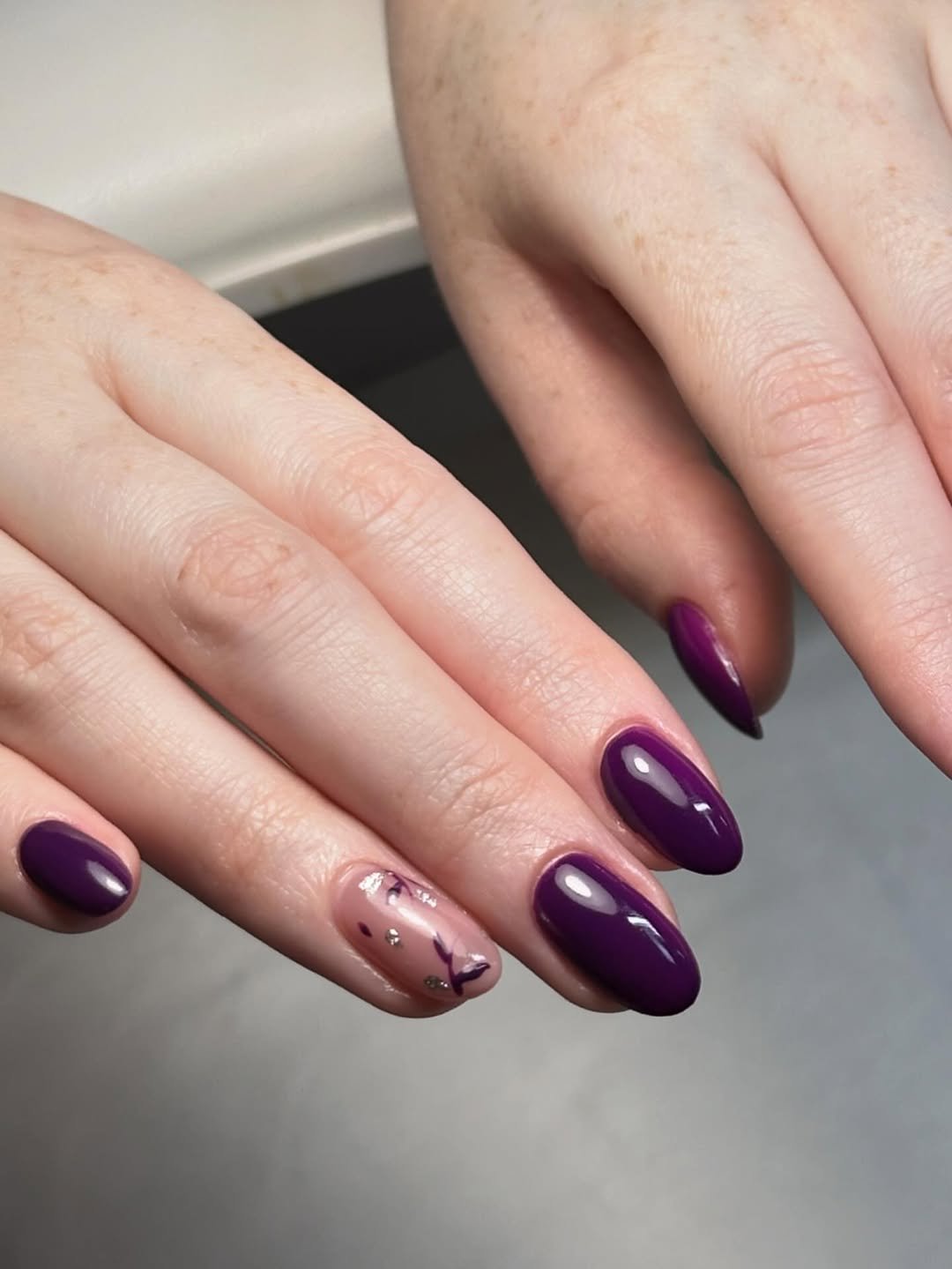 A rich plum shade wraps around each nail like velvet, grounded and quietly dramatic. Then there’s that single accent nail, soft, sheer, and touched with the faintest botanical detail.