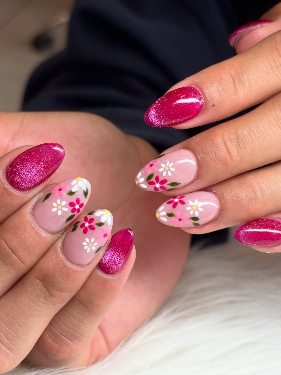 Tiny daisies scatter across a milky blush base, paired with a shimmering berry pink that catches the light with every movement. It feels like fresh flowers tucked into a silk dress.