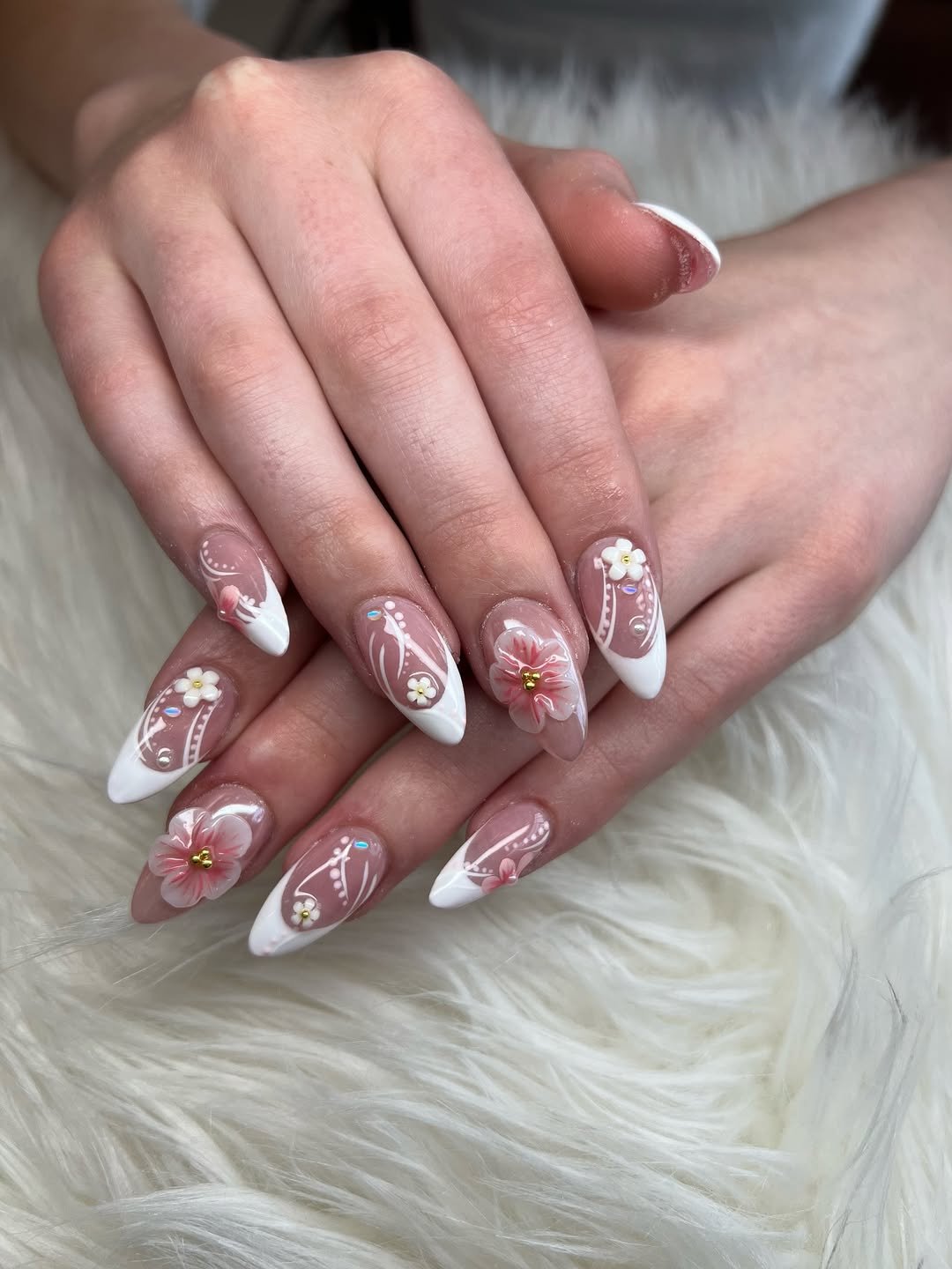 Classic French tips are reimagined with delicate white detailing and raised floral accents that almost look stitched onto the nail. Soft pink petals bloom at the center, adding a gentle focal point.