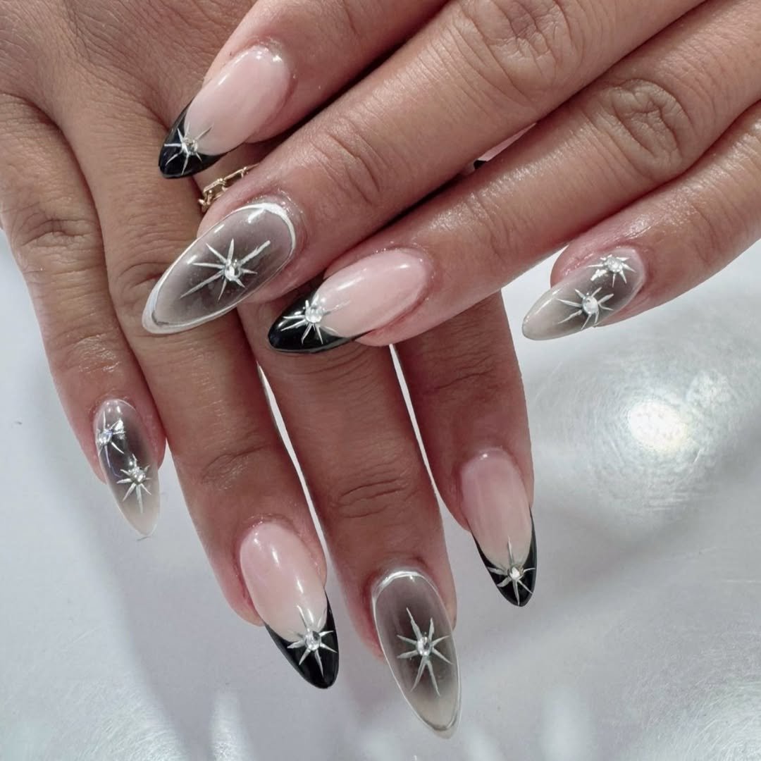 Smoky sheer bases fade into sharp black tips, finished with tiny starburst details that catch the light just enough. It feels sleek with a hint of cosmic drama.