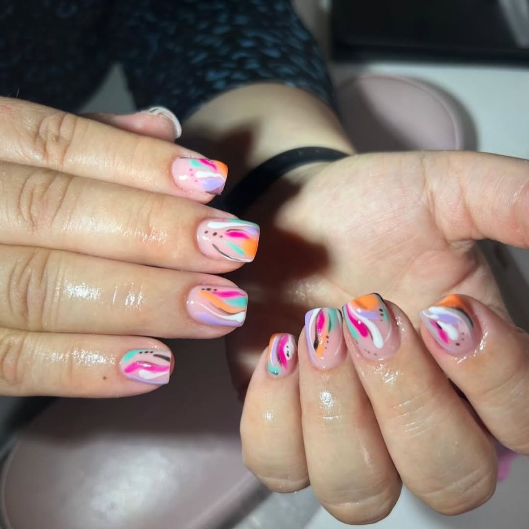 Short nails take on a dreamy blend of lilac, coral, mint, and white, swirled together like melted sorbet. The glossy finish gives everything that fresh, just-done glow.