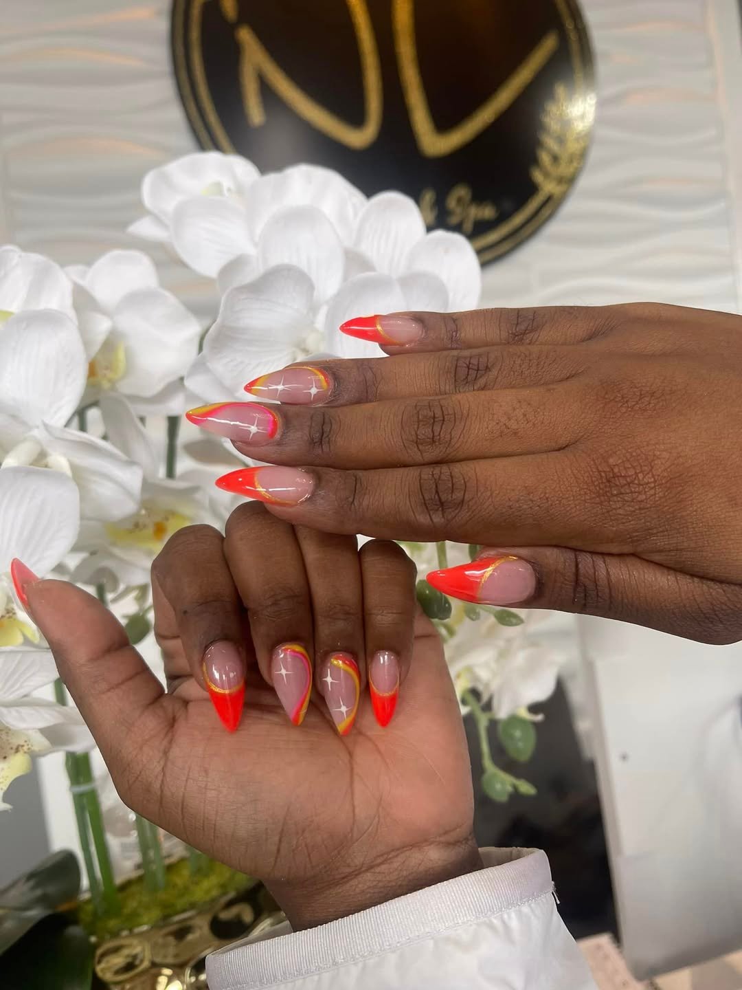 Electric orange tips flicker over a nude base, edged with soft yellow gradients and subtle sparkle details. It feels like heat rising off pavement in the middle of summer.