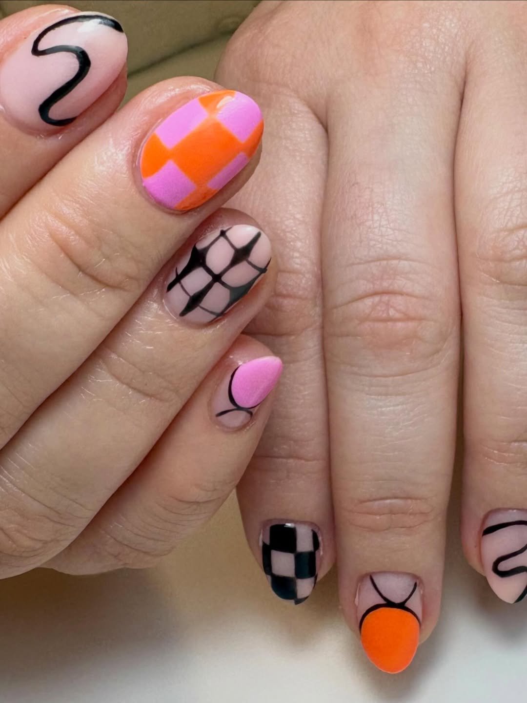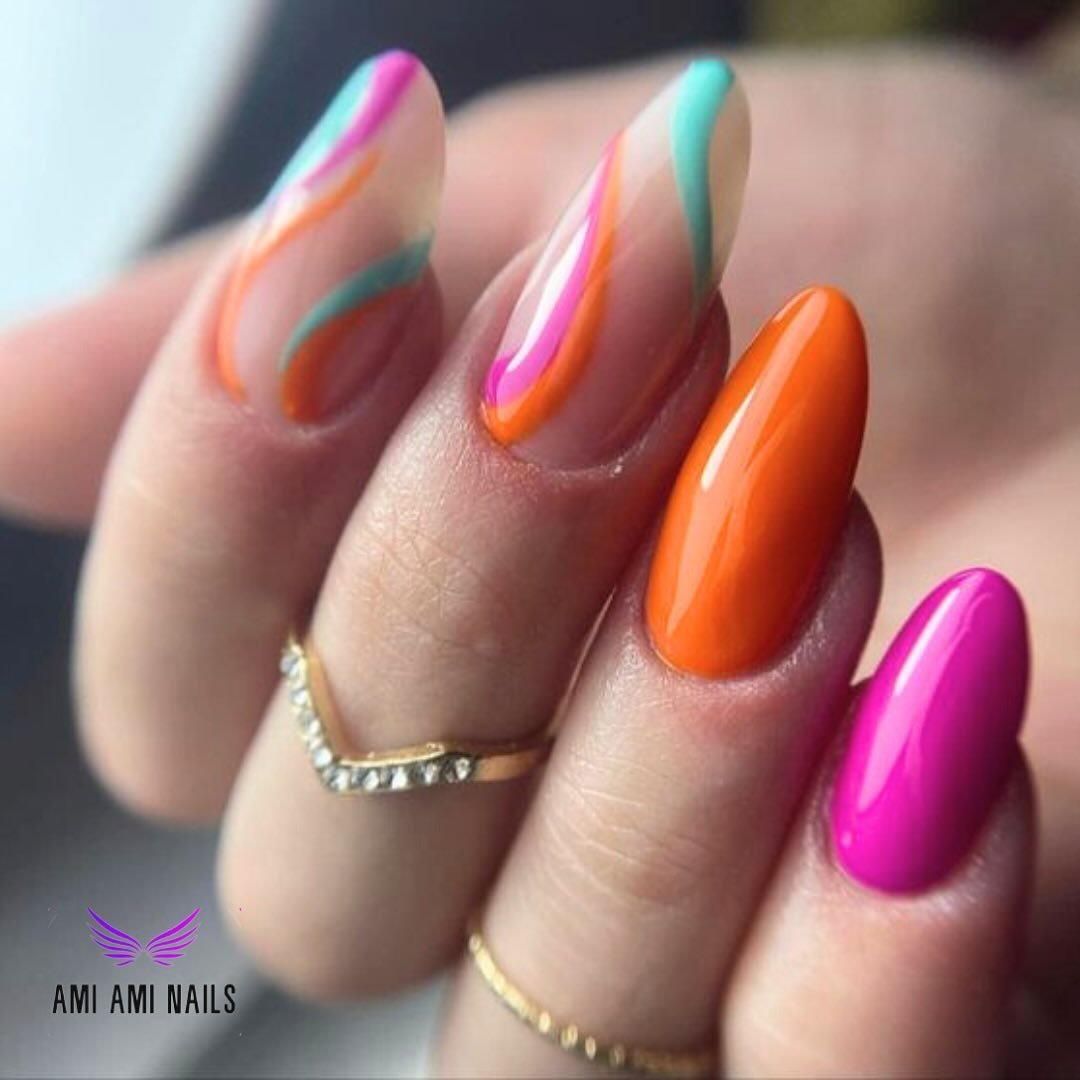 Hot pink, citrus orange, and a hint of mint glide across a sheer base in fluid, wavy lines. It feels like summer in motion, bold, playful, and a little bit hypnotic.