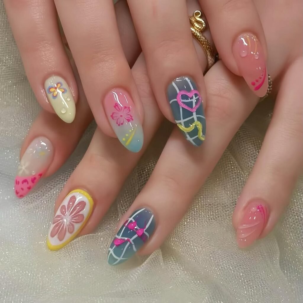 There’s a maximalist spirit here that still feels curated. Each nail tells its own story, but the shared palette ties everything together like a perfectly packed summer suitcase.