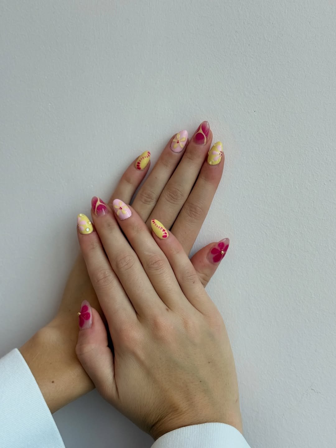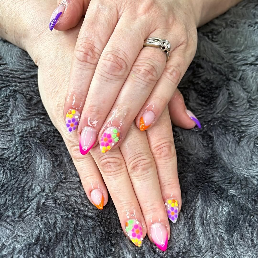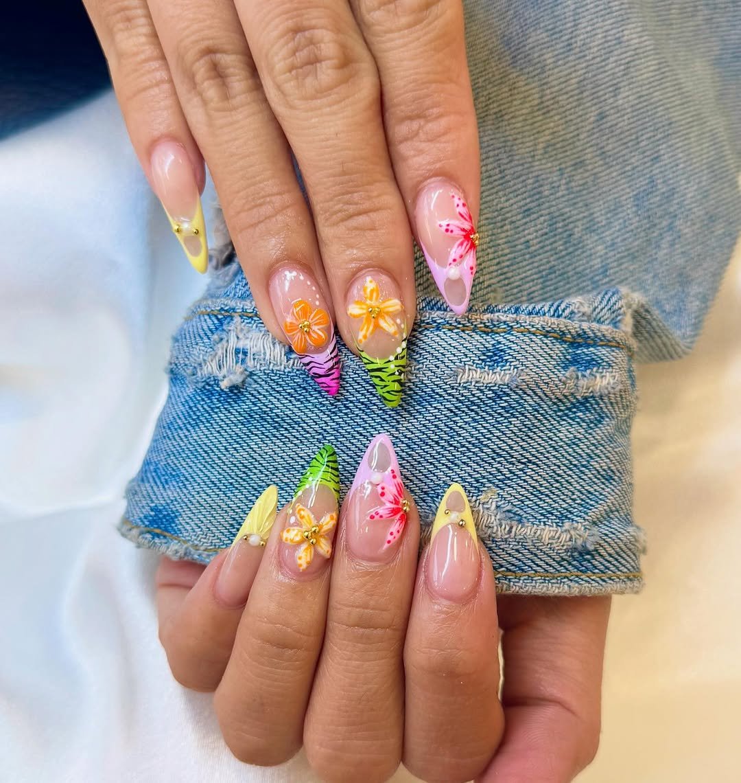 Long, sculpted tips bloom with neon florals, lime greens, and soft pastels layered over sheer pink. It feels like a tropical postcard, vibrant, sun-soaked, and a little indulgent.