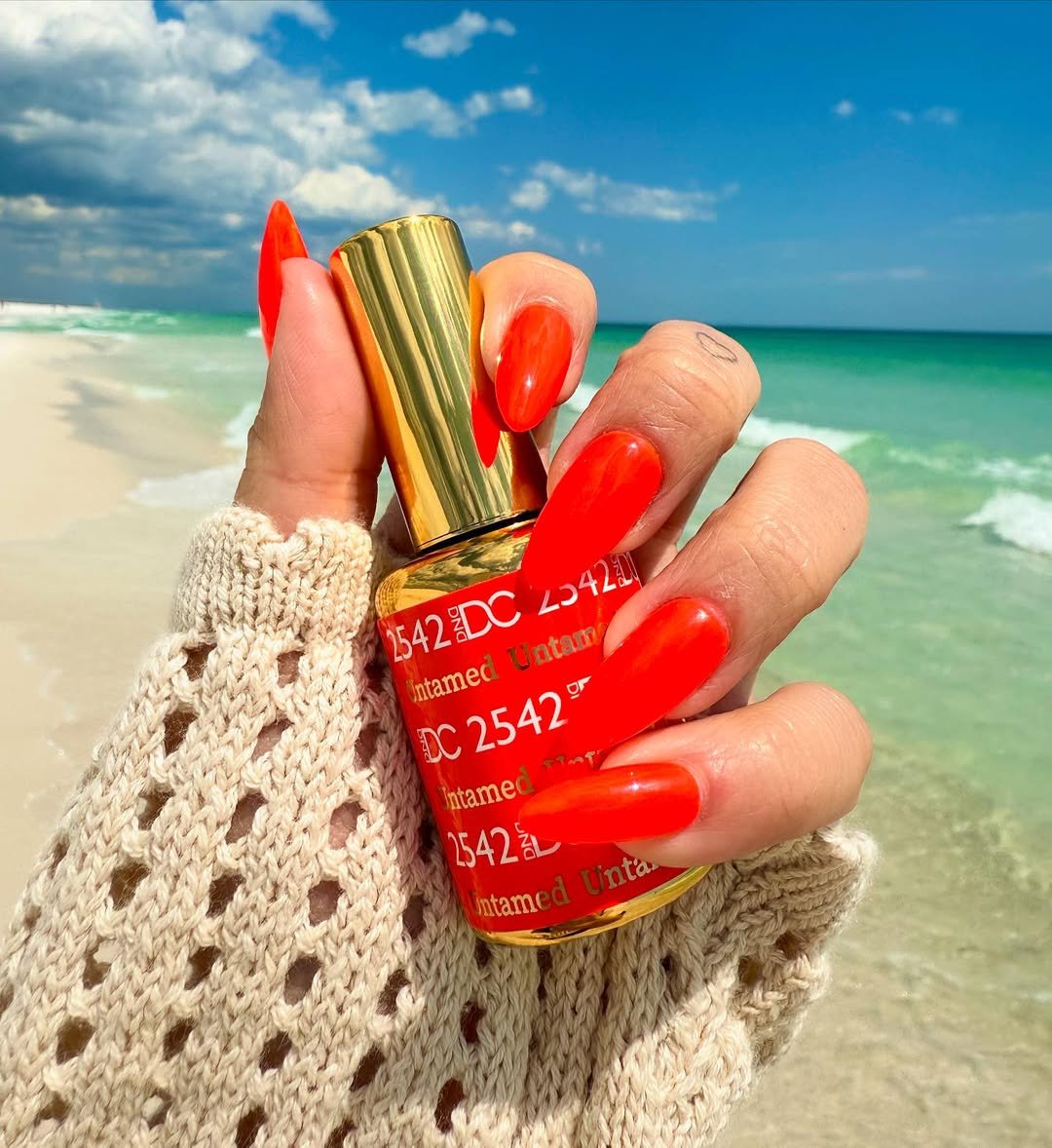 A punchy coral-orange polish, glossy and smooth, catches the light like the last hour before sunset. Set against the ocean backdrop, it feels warm, radiant, and full of life.