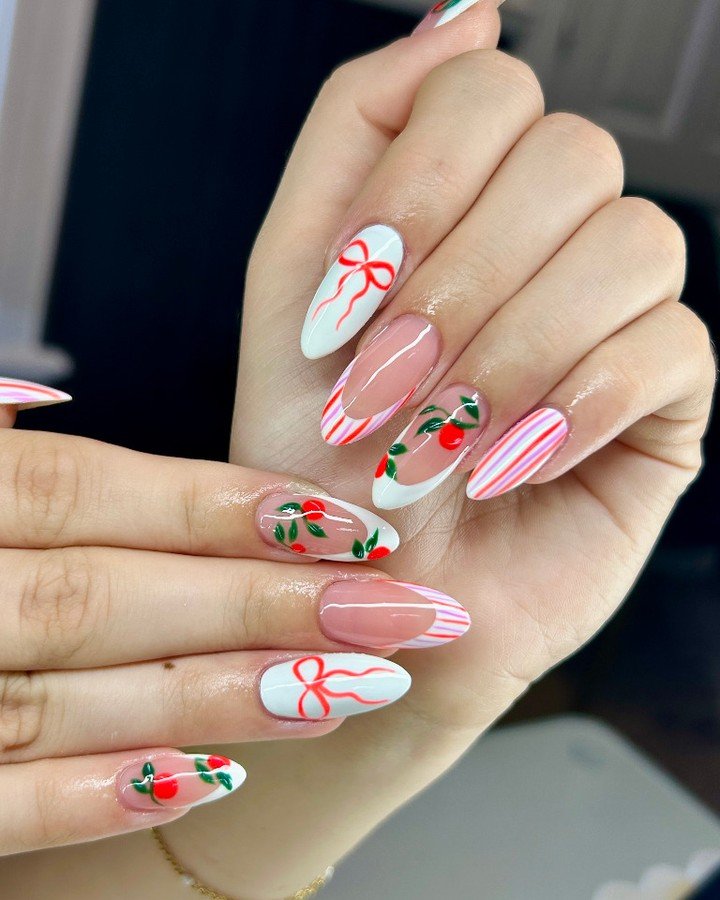 Tiny cherries, fine stripes, and ribbon-like bows sit over a milky base, creating a look that feels both sweet and slightly graphic. It’s playful, but still polished.