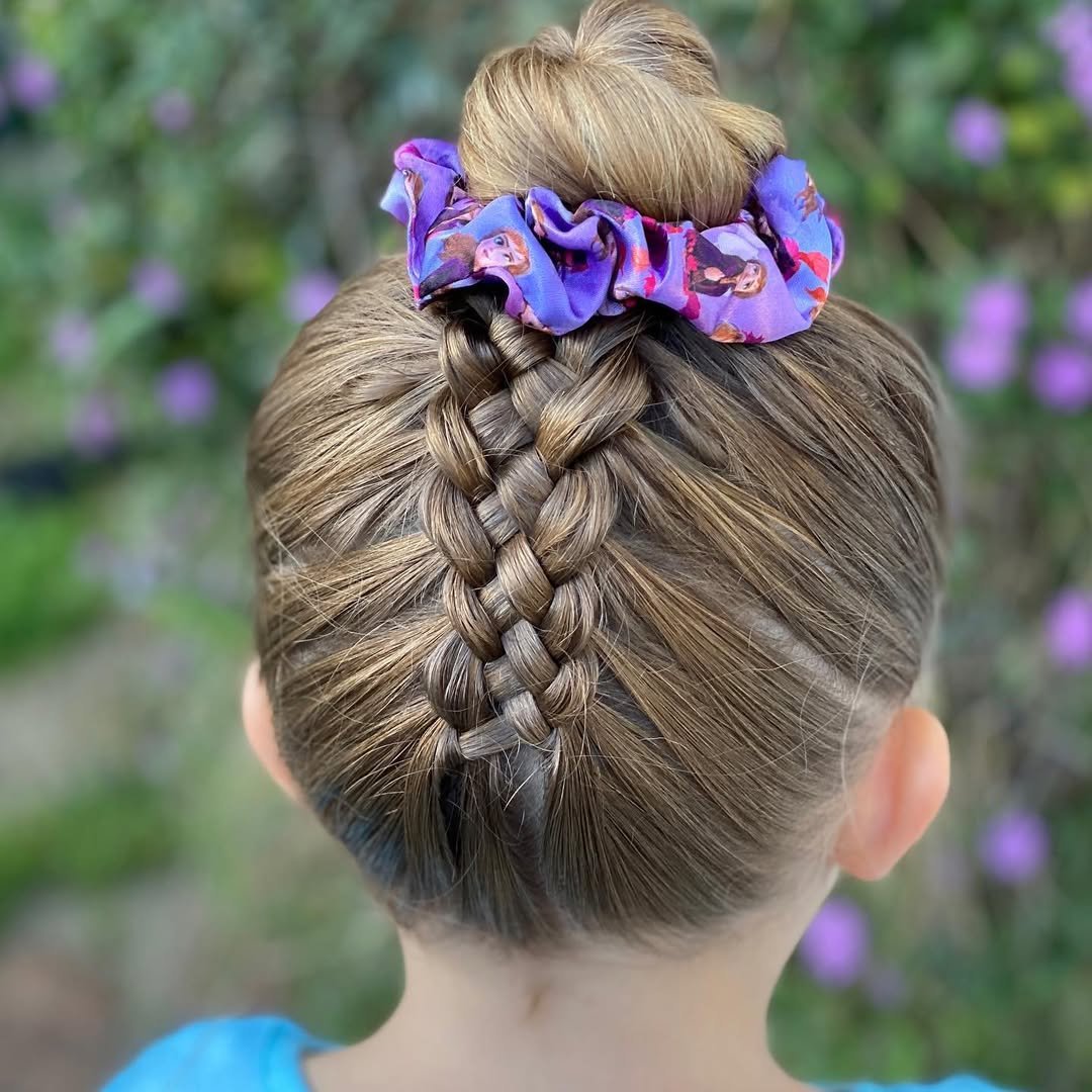 This style brings a casual-cool energy. A central braid leads into a bun that’s finished with a scrunchie, making it feel relaxed and wearable. It’s neat, but not trying too hard.