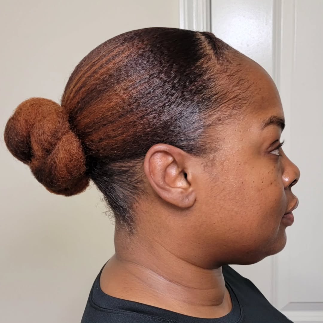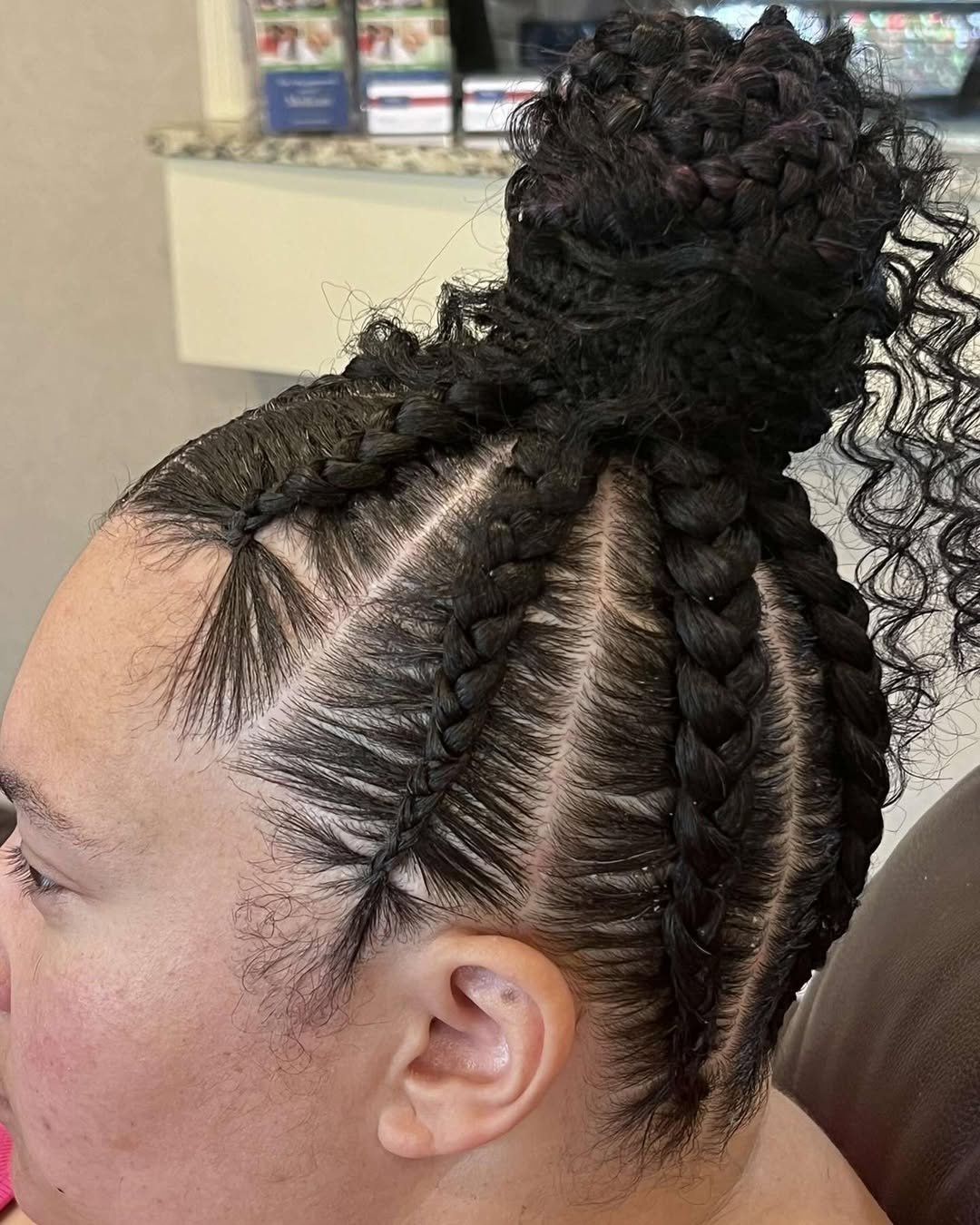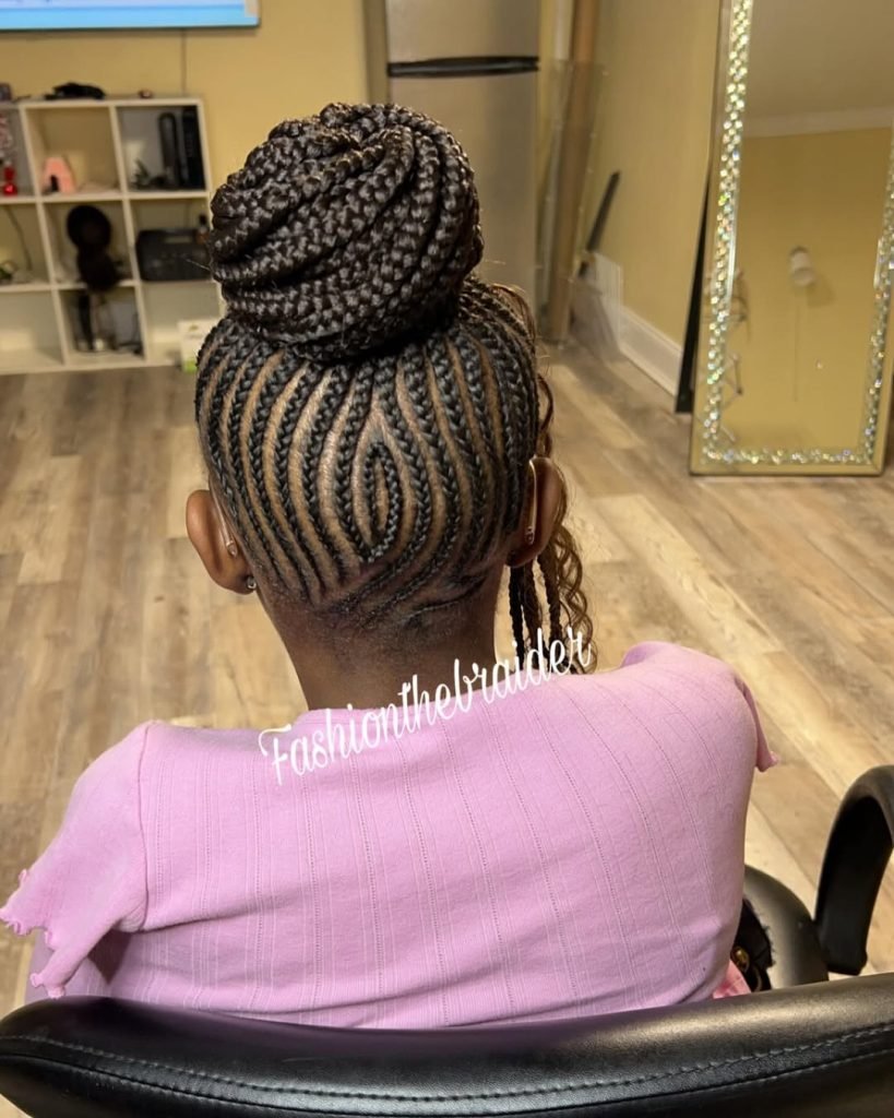 Now this is a statement bun. The cornrows at the back add visual interest, while the braided top knot brings height and drama. It’s bold, structured, and beautifully done.