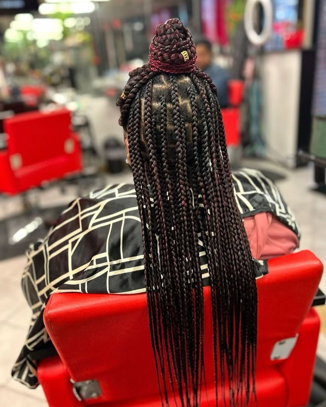 This look is all about contrast—in the best way. A tight, sculpted braided bun sits high and confident, while long, sleek braids cascade down the back like a statement accessory. It feels bold, modern, and very intentional.