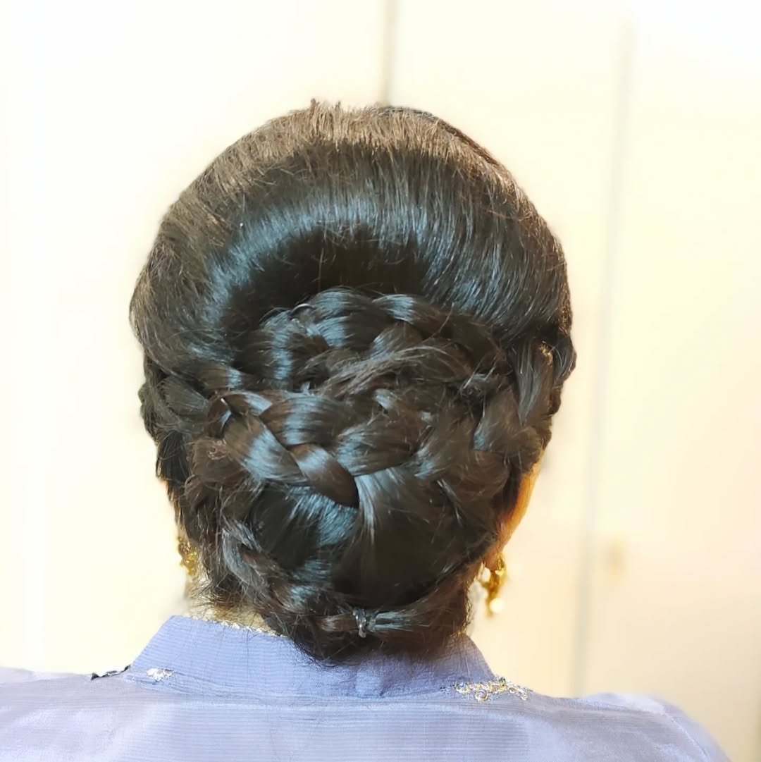 There’s something so grounding about this style. The braid is woven seamlessly into a low bun that feels traditional, polished, and timeless. Everything is smooth, glossy, and beautifully controlled.