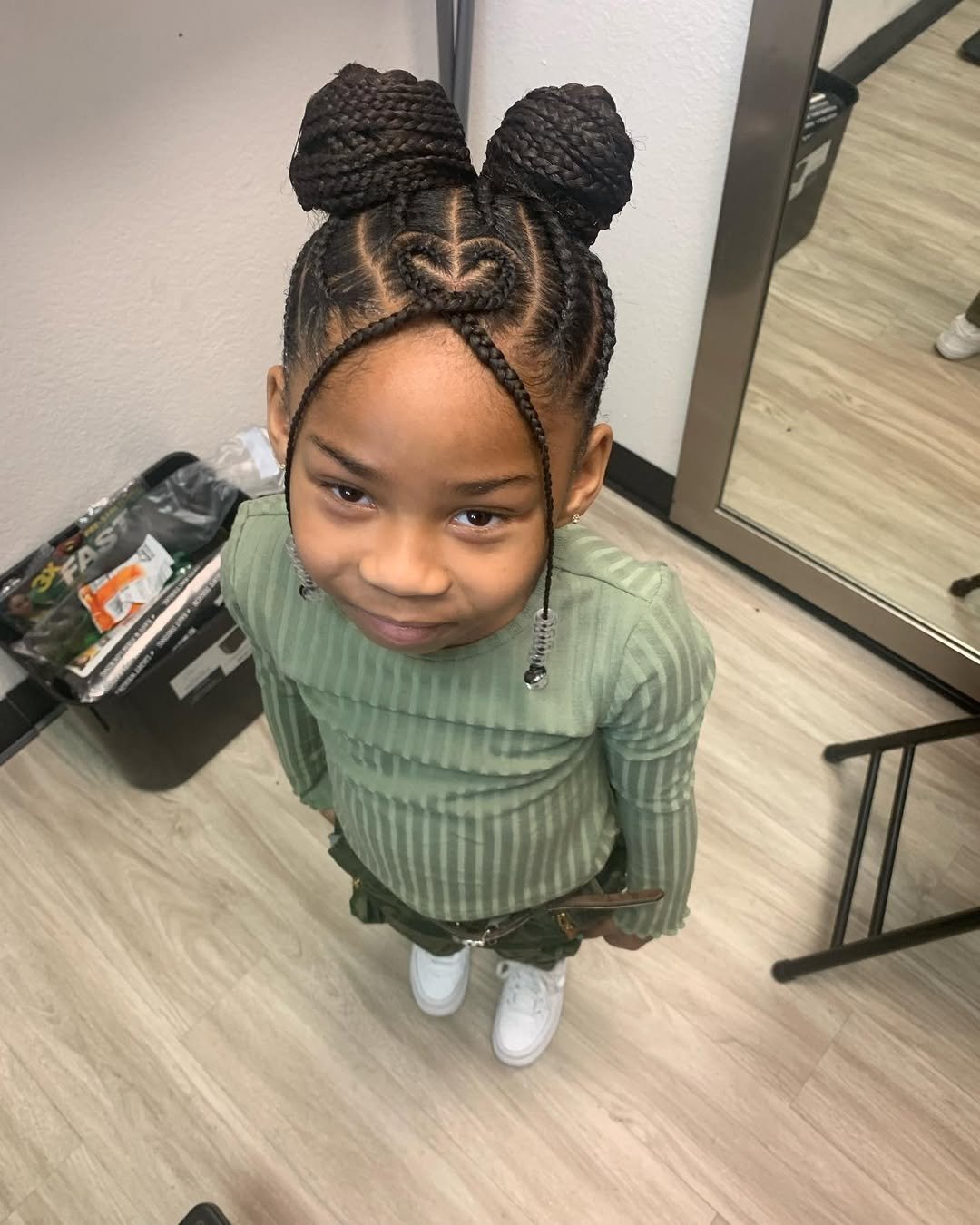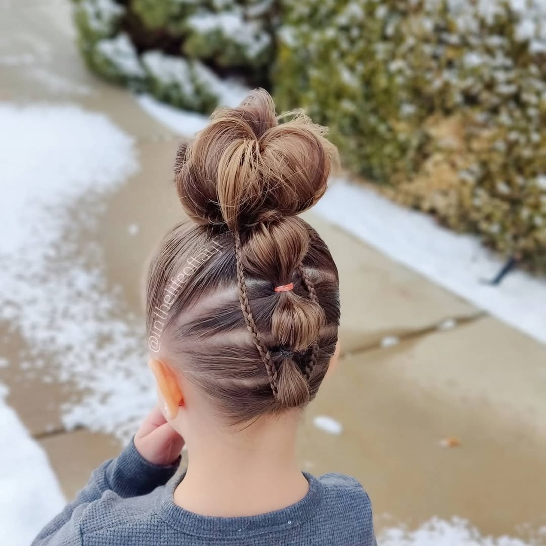 This one is pure fun. Two braided buns with heart-shaped detailing give the look a playful, creative edge that instantly stands out. It’s neat, detailed, and full of personality.