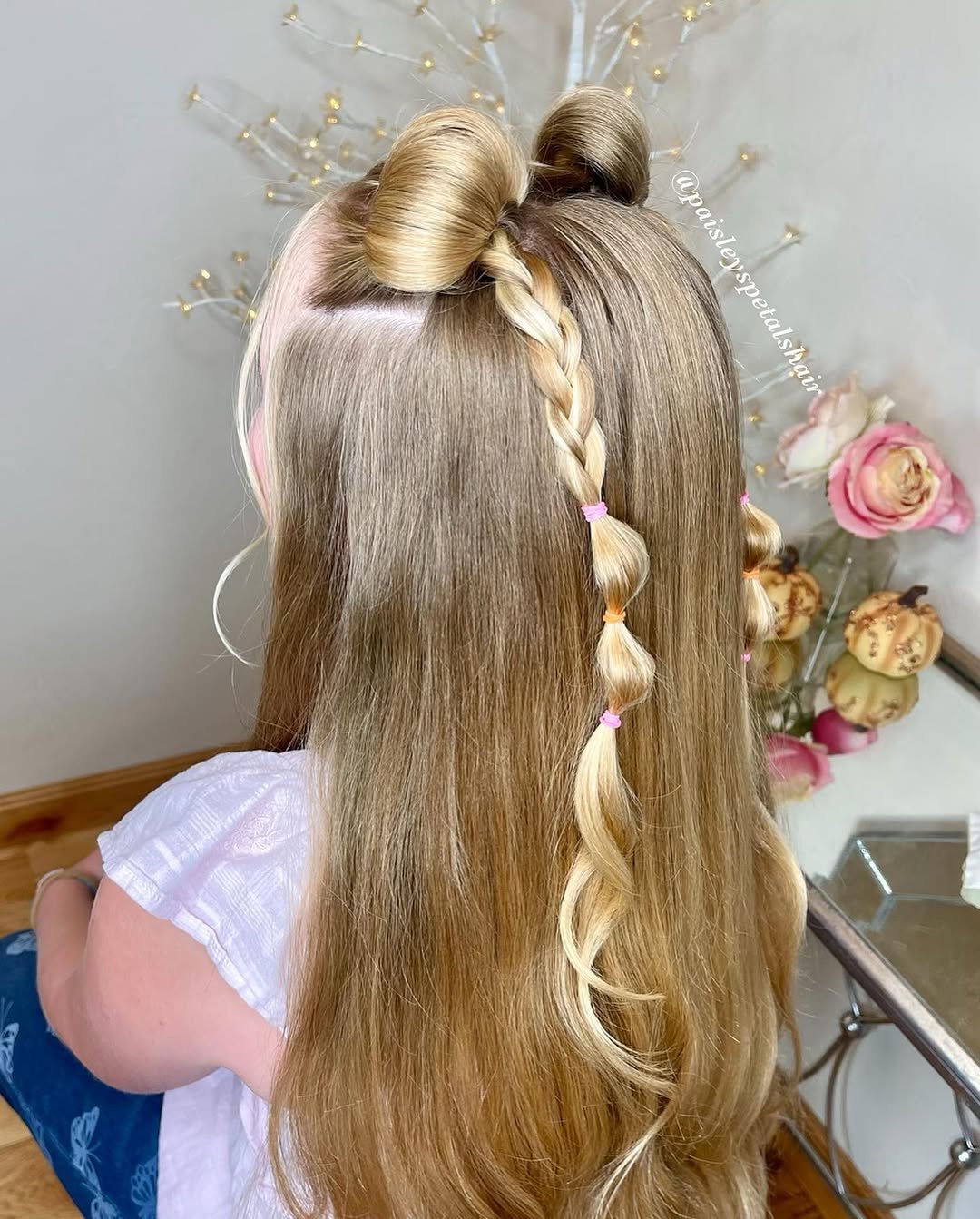Playful and sweet with a modern twist. The half-up bun is shaped almost like a bow, with a single braid adding charm and movement down the back. It feels youthful without being childish.