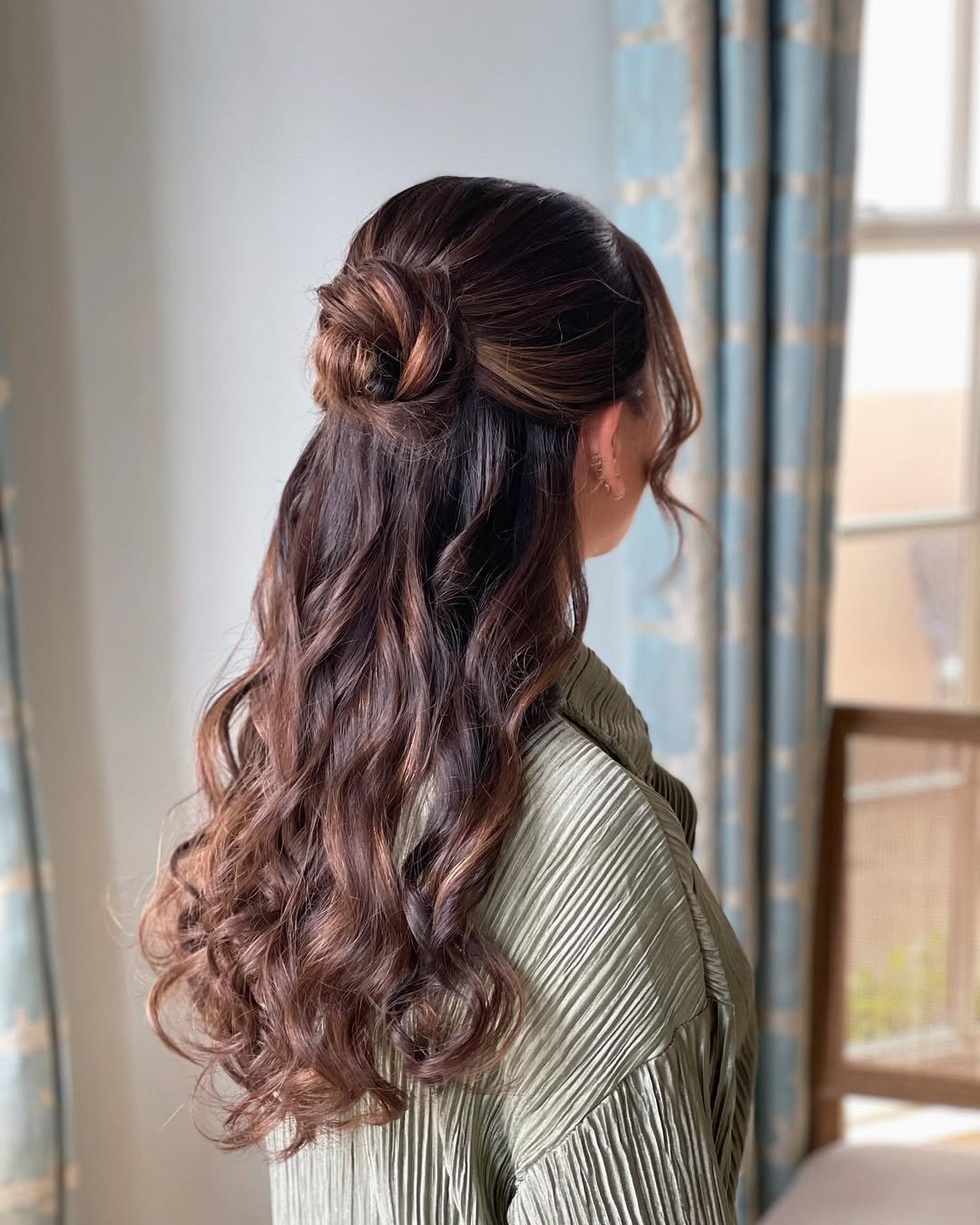 This style feels light and romantic. The half-up bun keeps things lifted, while the loose lengths add movement and softness. It’s relaxed but still styled.