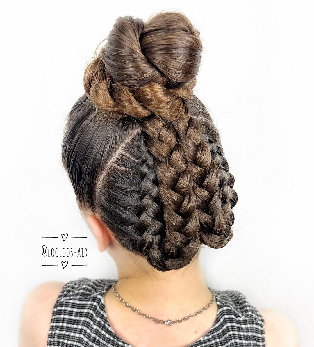 This one is so fun and creative. The stacked sections give the bun a playful, almost sculptural feel, especially paired with those sleek sides.
