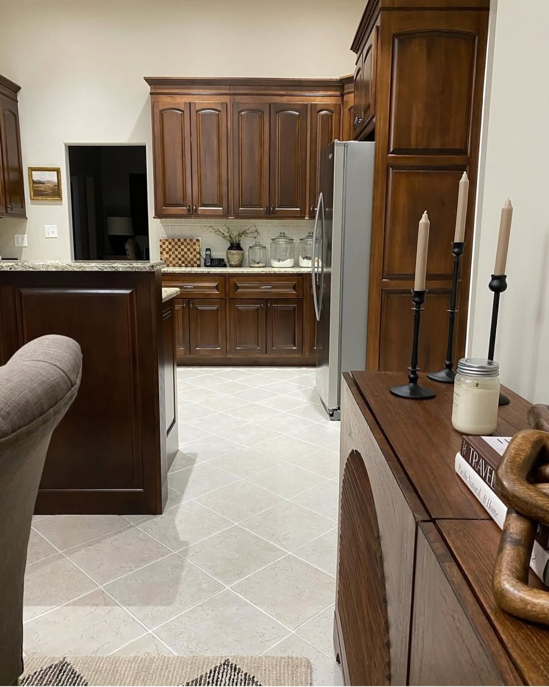 Neutral floors and soft lighting lighten the mood just enough. It’s the kind of kitchen that naturally becomes the heart of the home.