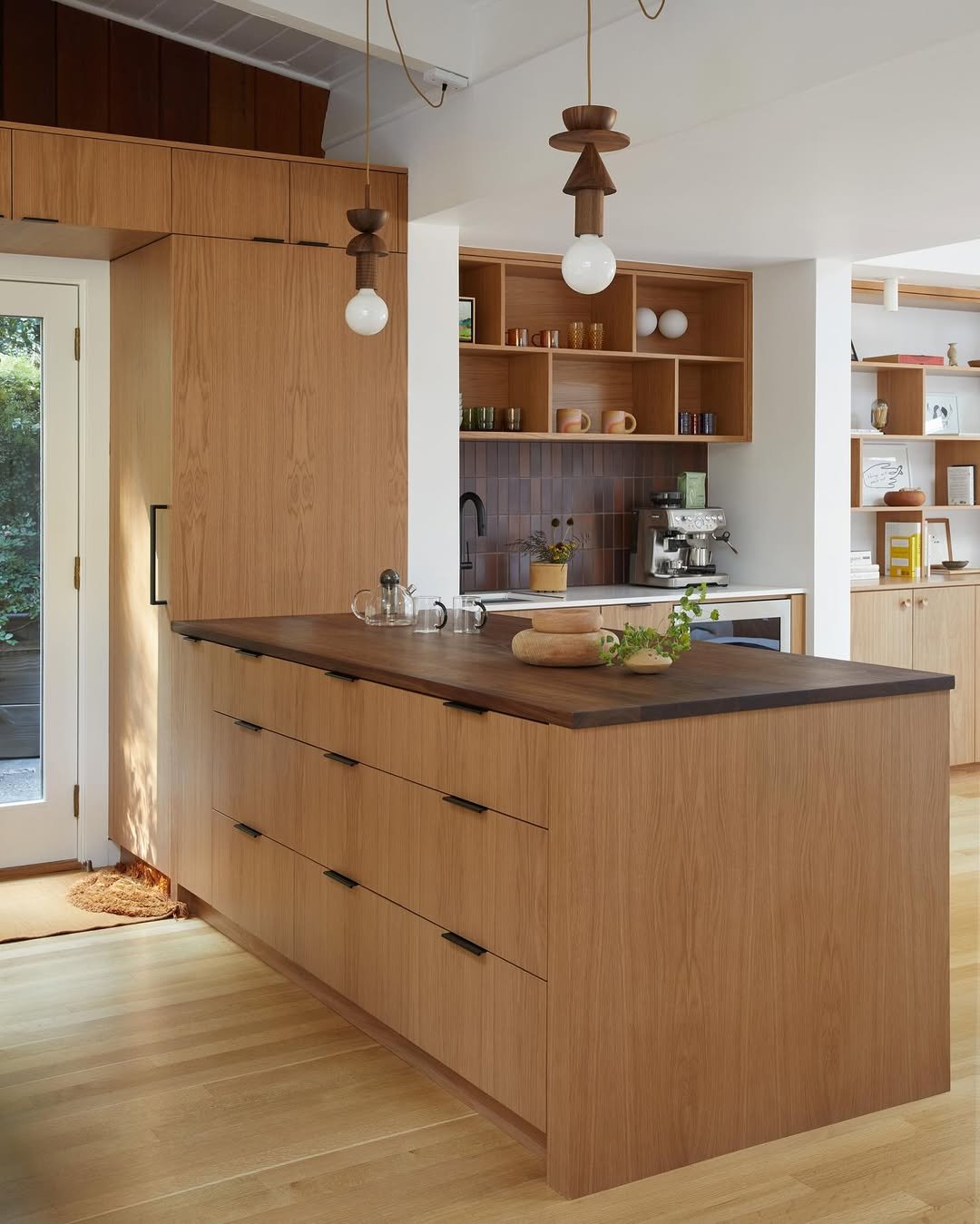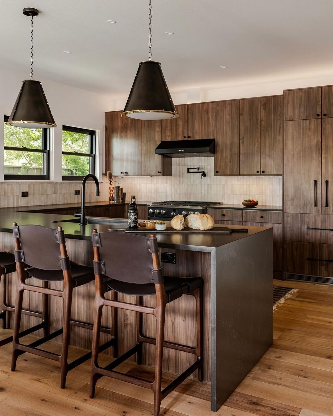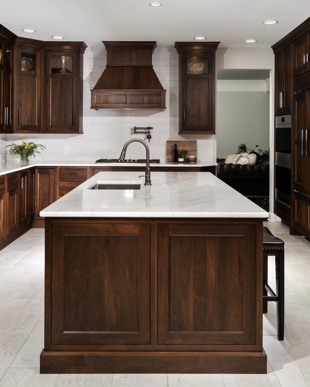 This kitchen leans into depth, with dark walnut panels wrapping the space in a way that feels almost cocoon-like. The soft tile backsplash lightens the mood just enough, giving your eye a place to rest between all that richness.