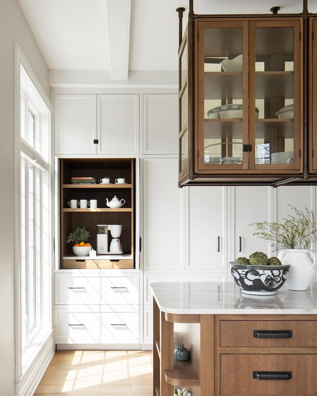 Sunlight spills across crisp white cabinetry, but it’s the warm wood accents that give this kitchen its soul. That glass-front upper cabinet feels almost like a curated display, turning everyday pieces into part of the design story.