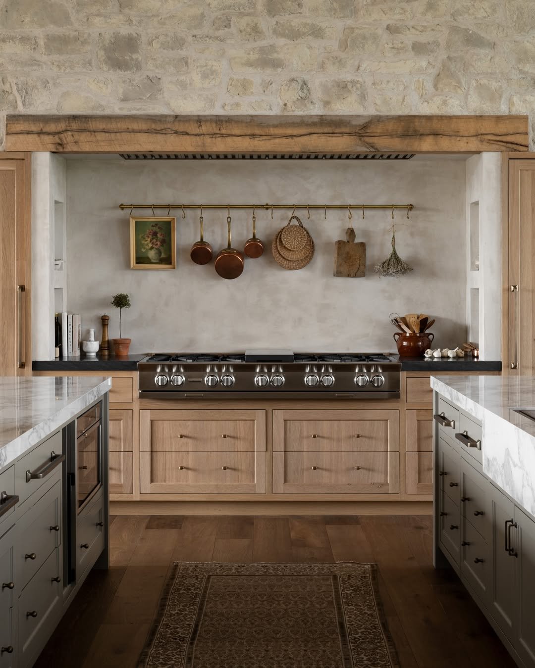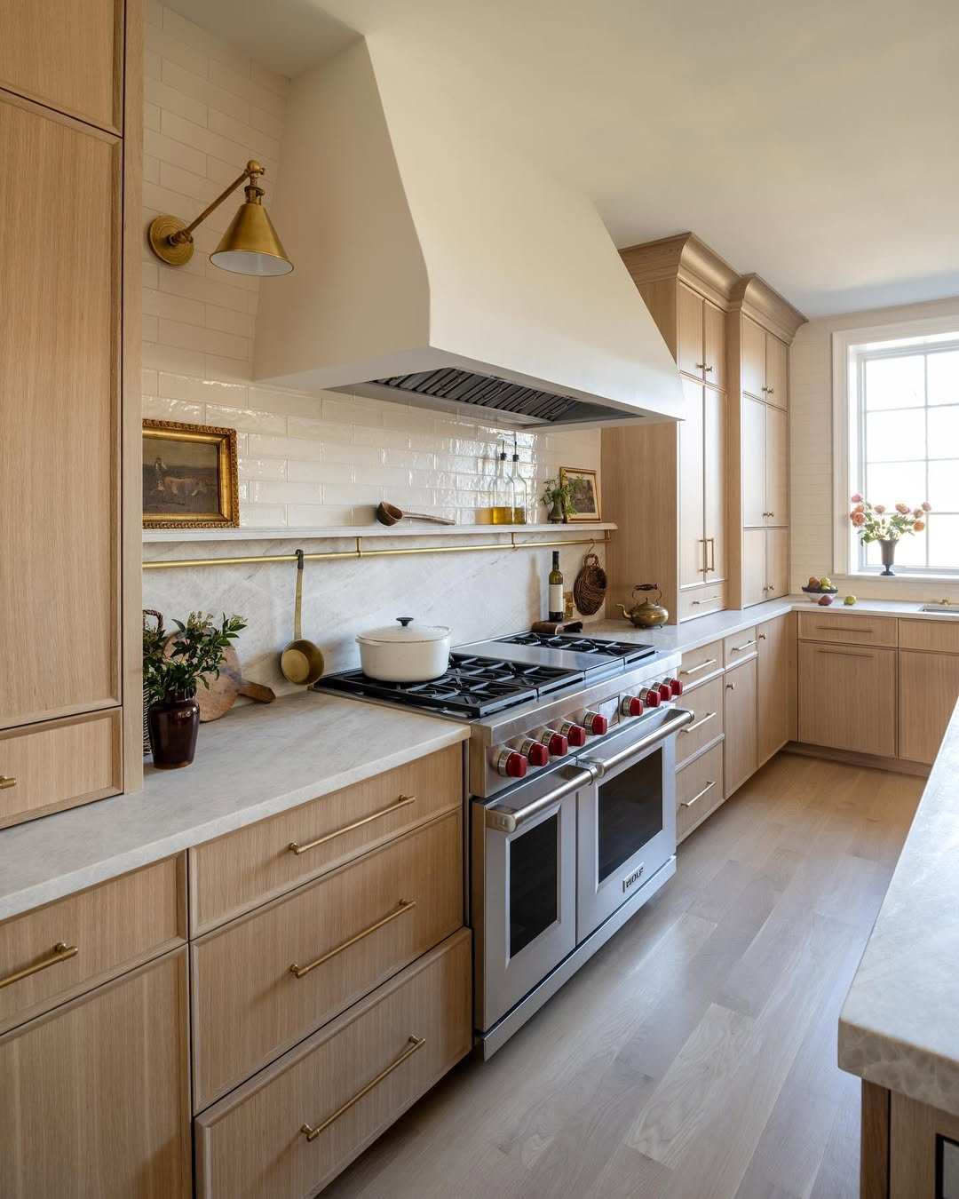 Light wood cabinetry paired with a plaster-like backdrop gives this space a soft, almost sun-washed feel. It’s understated, but every detail feels intentional, from the hanging copper pans to the delicate artwork tucked along the wall.