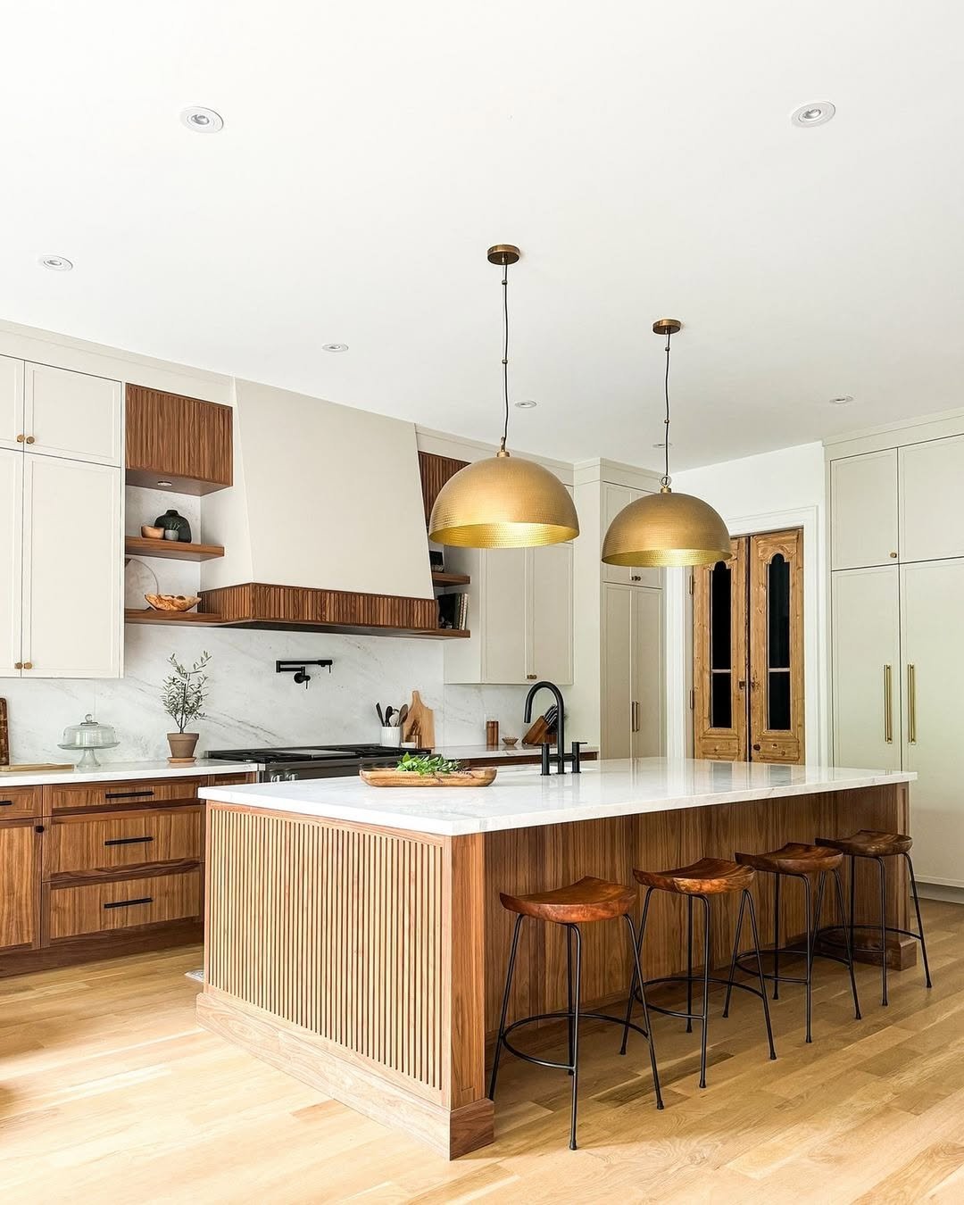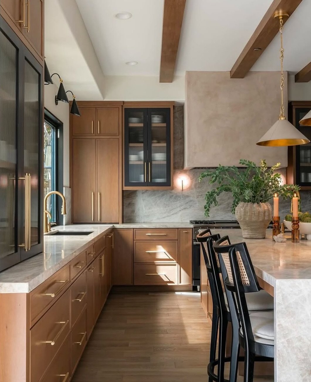 Warm wood cabinetry paired with brass lighting creates a soft, golden glow throughout this kitchen. Everything feels layered, but still incredibly cohesive.