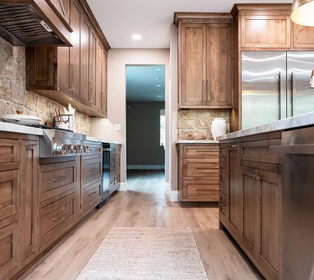 There’s a grounded, almost earthy calm in this kitchen, where textured stone walls meet rich wood cabinetry in the most natural way. It feels like a space carved out over time, where every material has a story and nothing feels overly polished.