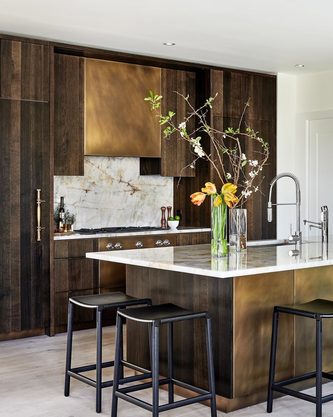 There’s something almost gallery-like about this kitchen, where deep walnut cabinetry meets brushed brass in the most composed way. The paneling feels intentional, almost architectural, and that warm metallic hood becomes the quiet focal point that draws you in without overpowering the space.