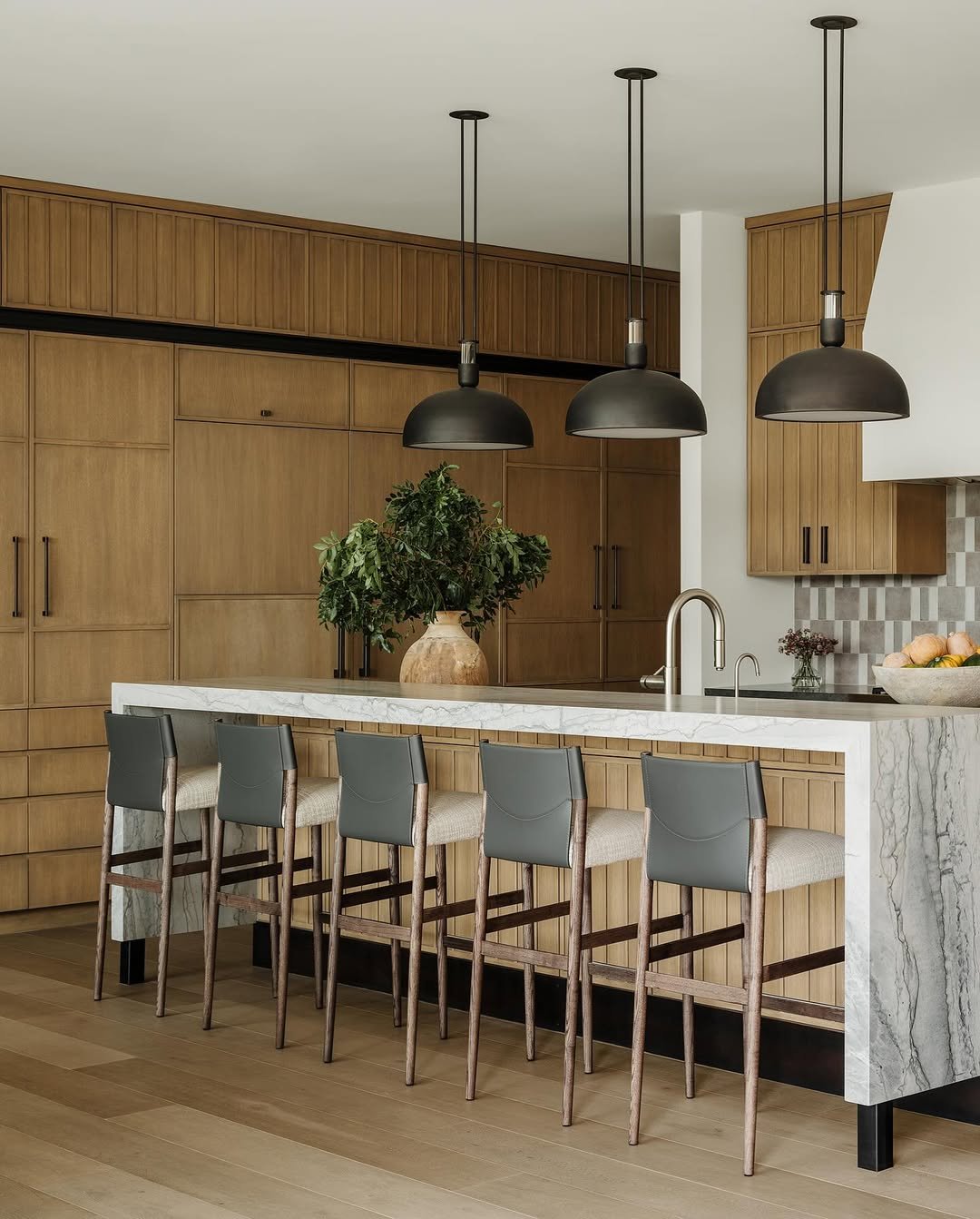 This one feels made for slow mornings and easy conversations. The oversized island anchors the space, while those leather bar stools bring in a relaxed, lived-in charm that softens the clean cabinetry lines.