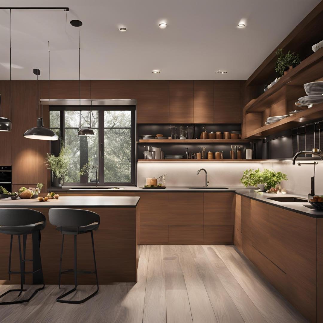 This final look leans into darker tones, wrapping the kitchen in warmth and depth. The cabinetry feels refined, with just enough detail to keep things interesting.