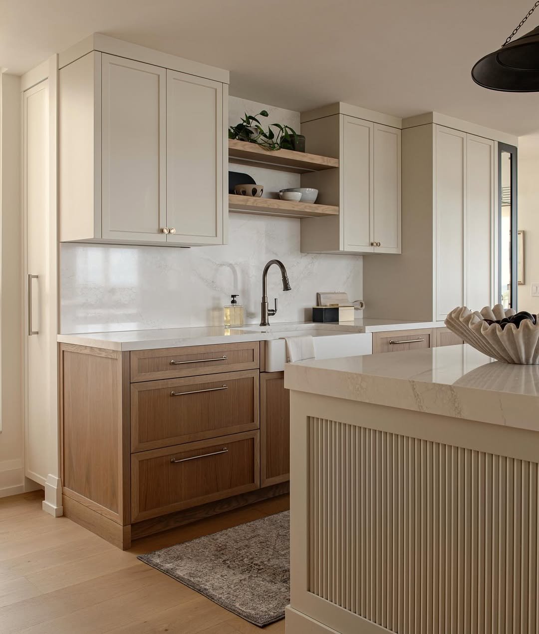 This kitchen plays with contrast in a softer way, pairing light cabinetry with warm wood accents. The result feels calm and layered.