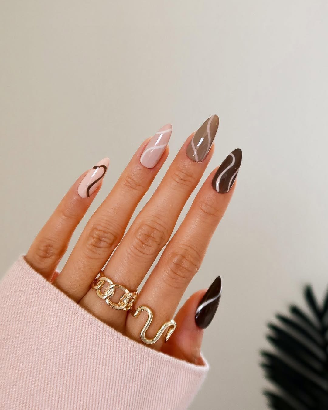 This mani is a whole art exhibit. @vivianmariewong pulled out the stops with an abstract swirl design in soft mocha, taupe, and milky latte shades. The negative space keeps it fresh, while the sharp almond tips add a touch of drama.